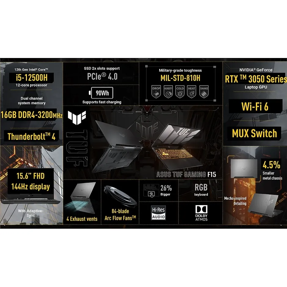 Jump right into the action with the Asus TUF Gaming F15 laptop. Stream and multitask with ease thanks to an Intel Core i5-12500H processor and 16GB of fast 3200MHz DDR4 RAM on Windows 11. Leverage the full gaming performance of the GeForce RTX 3050 laptop GPU with a dedicated MUX switch. When your game library gets full, an empty M.2 NVMe PCIe Gen 4×4 SSD slot makes upgrading storage capacity a breeze. Modern gaming laptops use powerful, dedicated graphics chips for high performance, but most route those frames through the CPU’s integrated graphics before reaching the display. This offers up to 9 hours of battery life, but prevents your GPU from giving its absolute best performance. The laptop provides an MUX switch for competitive games: you can switch to a direct GPU mode that reduces latency and boosts performance by an average of 5-10%.