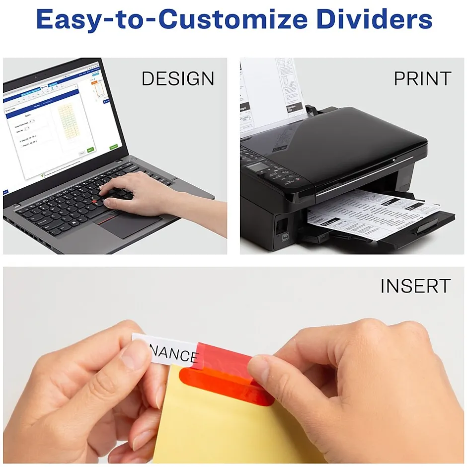 Avery(R) 8-Tab Binder Dividers with Insertable Big Tabs are a fast and simple solution to paper organization. Big Tab(TM) dividers provide enhanced tab visibility with 50% more writing space than standard divider tabs, allowing for bigger fonts and handwriting. Special tab design keeps inserts locked in during use, but the easy-access slot makes them painless to remove. These page dividers are made of durable buff colored paper, with double-sided gold reinforced holes that are tear resistant so you can flip through your 3-ring binder with confidence. Sturdy and built to withstand everyday use, this multicolor set of 8-tab dividers is great for organizing schoolwork, personal finances, recipes, coupons, sheet music,or anything else that needs sorting. Tabbed dividers are 3-hole punched and ready for immediate use. For a clean, professional look, personalize your page tab inserts using free templates, fonts and designs at avery.com/templates. Inserts are compatible with laser and inkjet printers.