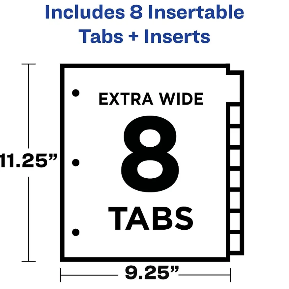 Keep your binder organized and in style with these Big Tab Insertable Pocket Dividers. The wide design works perfectly with sheet protectors so that you can still view your tabs at a glance. Enjoy two-toned, multicolored tabbed dividers with pockets that are perfect for quick content identification and organization. Each 3 ring page divider features front and back pockets made of durable plastic to accommodate loose papers up to 8.5″ x 11″. The Big Tab design offers 1.5 times more printing space on the tab inserts than on standard plastic dividers, so you can use larger fonts or more lines of text for easier reading and referencing. The 8-tab divider set includes a secure indent point on each tab that keeps inserts from falling out. Write directly on insert labels or use the free templates and fonts on the Avery site to customize the inserts for your tab dividers for 3 ring binders and print them in minutes on your laser of inkjet printer. Ideal for schoolwork, personal finances, reports, recipes and more. This item comes with a set of 8-tab binder dividers for a total of 8 multicolor binder dividers with pockets.