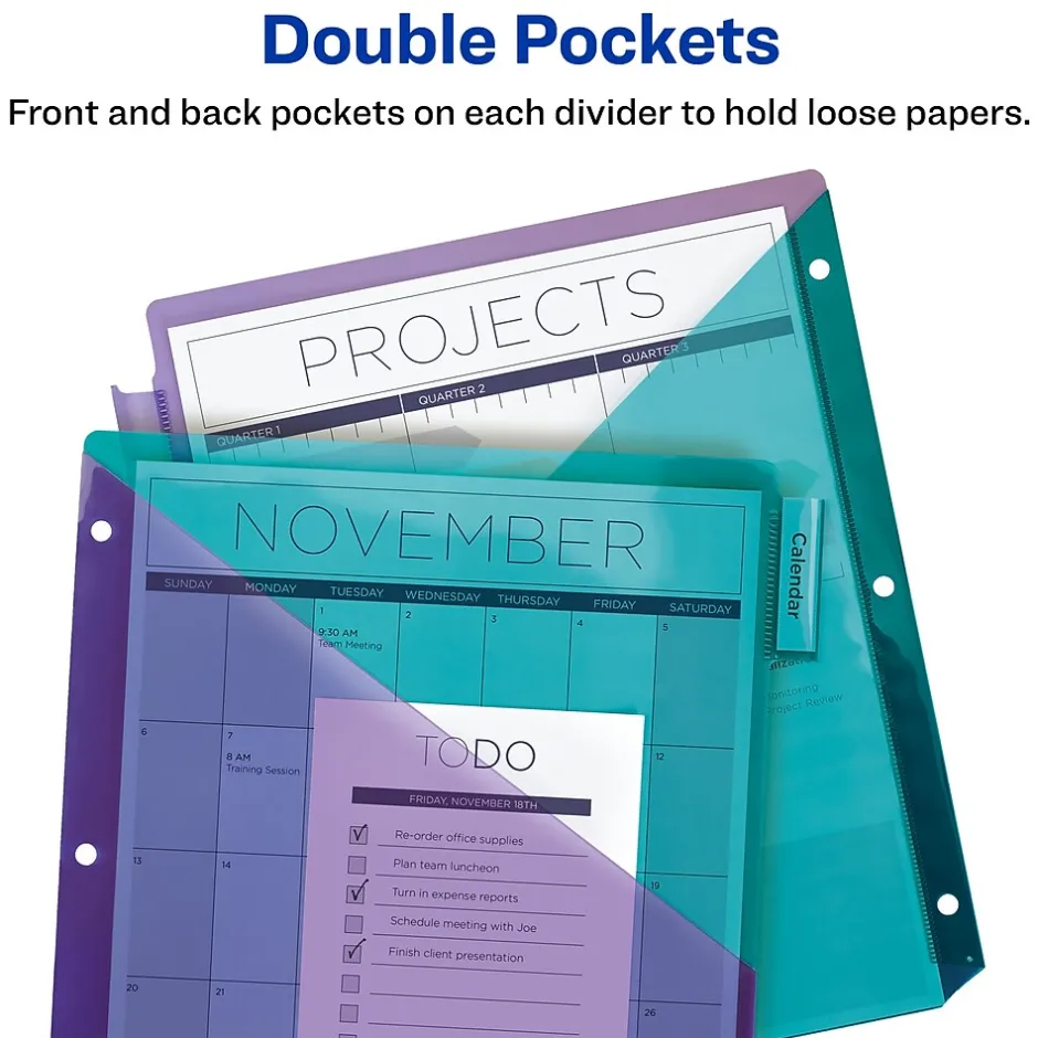 - Store loose papers and unpunched sheets within the front and back pocket of each 8-tab binder dividers