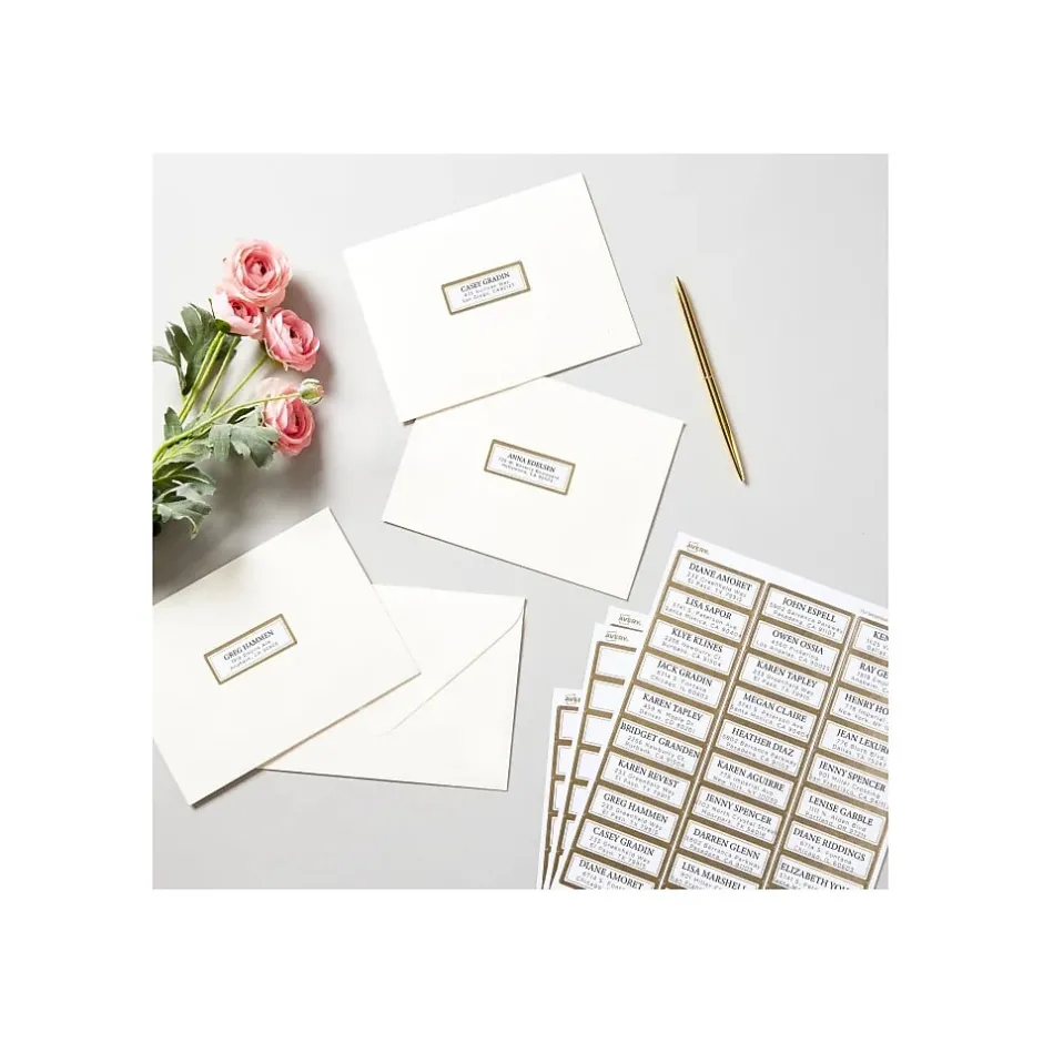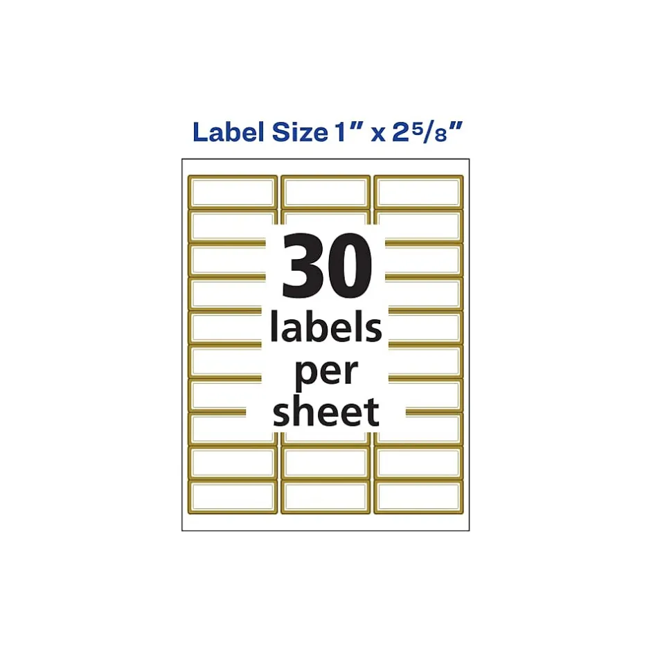 Stunningly elegant and reflective, the Avery matte white rectangle label with metallic gold-tone borders brings a radiant shine to any project or event. The label is preprinted with a mirror-finish gold-tone border that will capture everyone’s attention. Pair this label with other Avery labels and cards with metallic gold-tone borders for the complete look. Avery Easy Peel technology makes it simple to quickly peel and place labels. Just bend back the label sheet to reveal the pop-up edge to peel up each label without the risk of tears or rips. The permanent label adhesive will stick and stay to a variety of surfaces including paper, envelopes, cardboard, glass, metal, and more. Customize beautiful designs and personalize your own address labels, product labels, food labels, party favor labels, holiday cards, and more using the free templates and design tools on the brand’s website. Compatible with both laser and inkjet printers.
