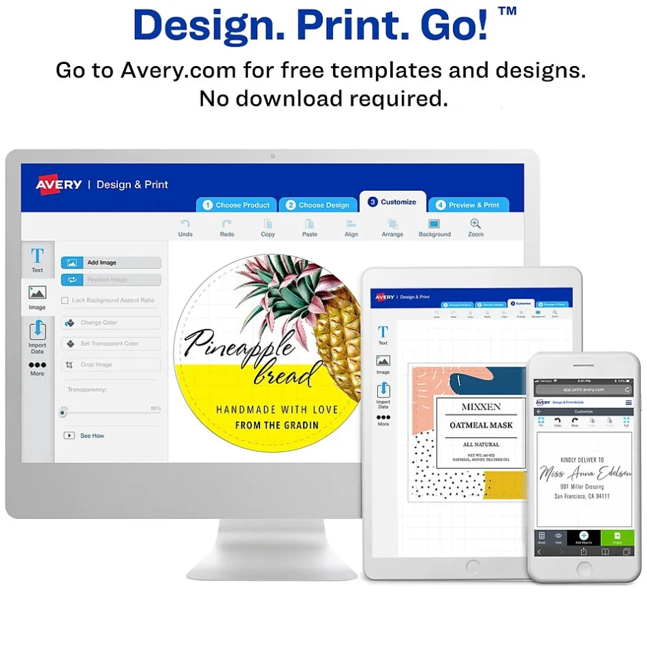 Add a special finishing touch to any product, gift, or personal creation with these professional looking Avery matte white labels. Our print-to-the-edge capability allows you to create bright, eye-catching, full bleed labels with sharp text and crisp images printed right to the edge of the round sticker label with no border or margin. Each sheet of labels features Sure Feed(R) technology which helps deliver a more reliable feed through your printer to prevent print misalignments and paper jams. Our round printable stickers are quick and easy to apply with our patented Easy Peel label sheets with Pop-up Edge. Simply fold the sheet back to display the label edges for convenient and fast peeling that saves time and avoids label waste. A strong permanent adhesive is used to make sure that these small round labels stick and stay to paper, cardboard, plastic, glass, metal and more, without curling or falling off. Compatible with both laser and inkjet printers. Avery Design & Print makes it easy to create customized labels from your own home or business. The free browser-based software has everything you need to design pricing labels, mailing seals, planner stickers and product labels for bath salts, essential oils, beauty products and more. Try it out today at avery.com/templates.