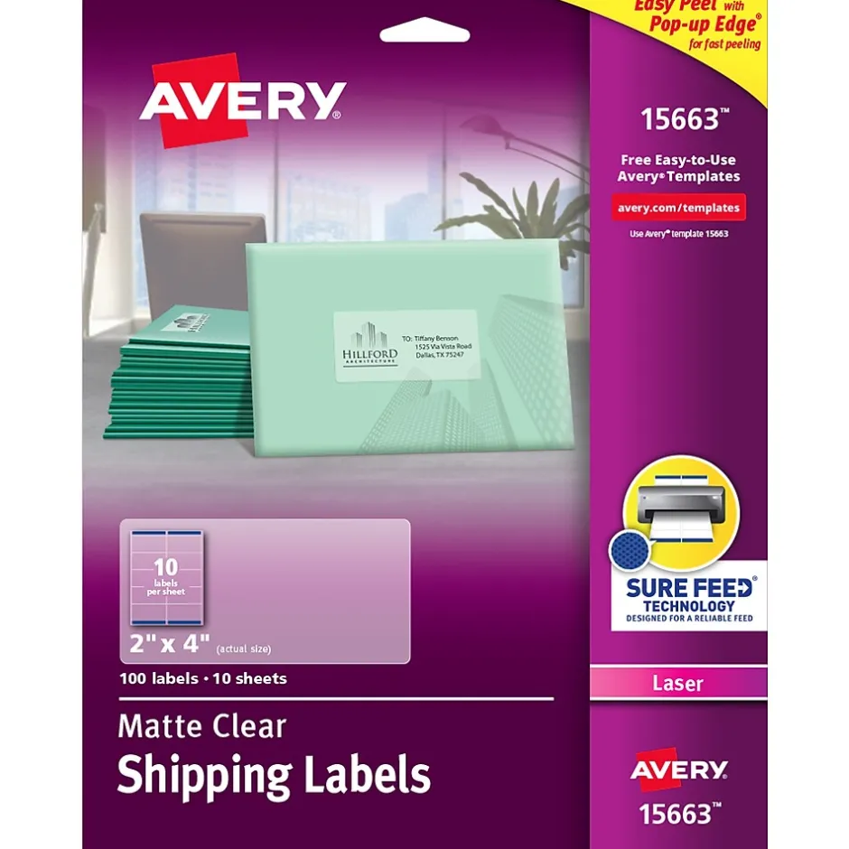 Get shipping projects underway with these Avery 2 x 4-inch shipping labels. The stickers become virtually invisible once applied to textured and colored surfaces, giving packages and envelopes a printed-on look. Customize and print templates from Avery Design & Print with any laser printer to give these Avery 2 x 4-inch shipping labels a personalized appearance. These labels also feature exclusive Avery Sure Feed technology to improve print alignment and avoid jamming.