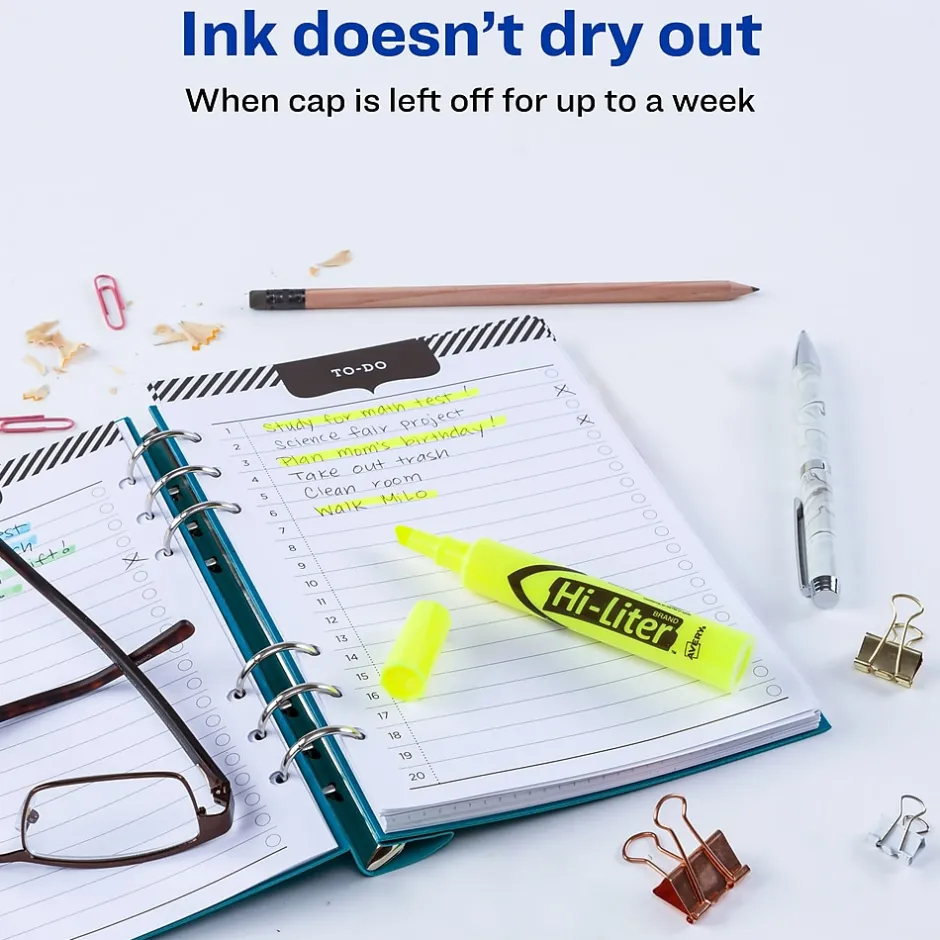 Outline important passages with these desk-style highlighters. Featuring versatile chisel tips, these highlighters let you make thin or thick lines for custom marking, and the vibrant yellow ink stands out on white paper. These Avery Hi-Liter highlighters feature non-toxic ink with Smear Safe technology to prevent smudges for smooth, neat lines.