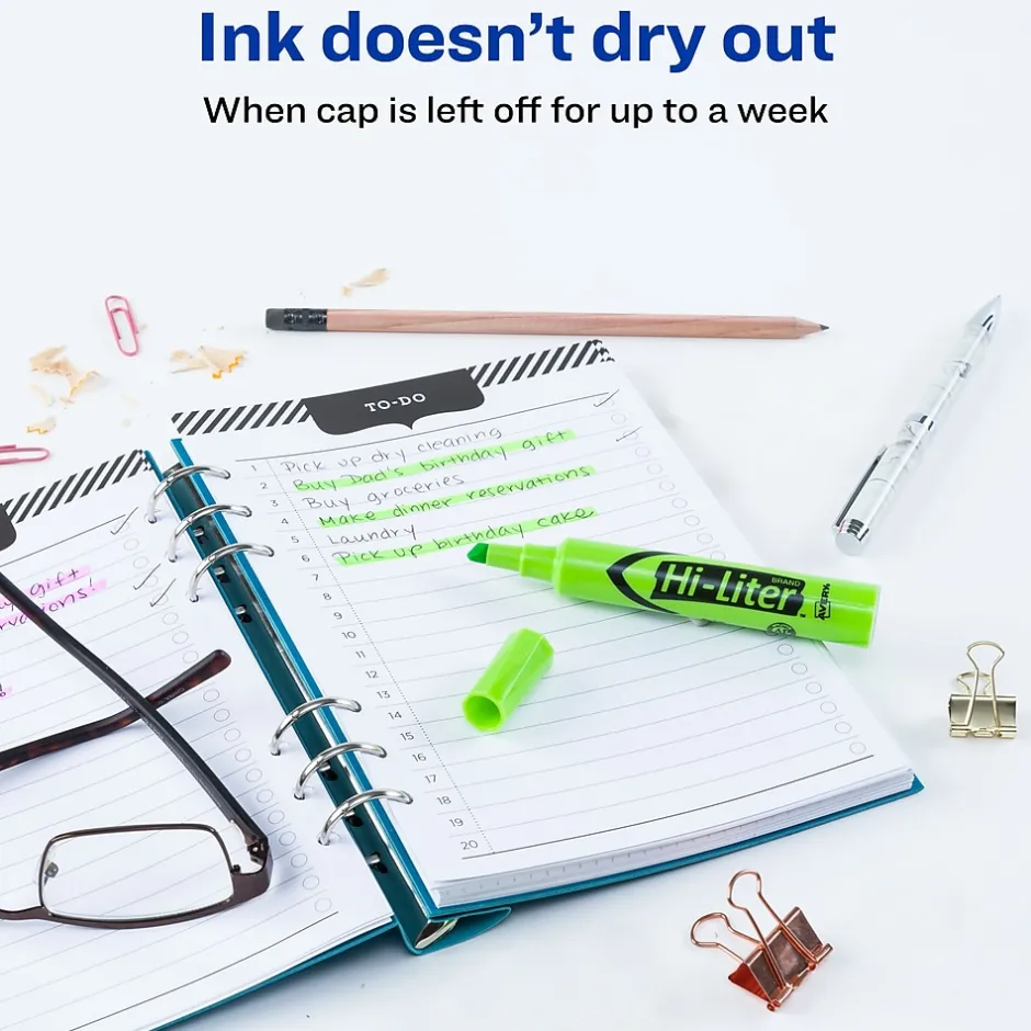 Take note of critical points with these desk-style highlighters. The chisel tips let you select between underlining or highlighting, and the fluorescent green color stands out on the page. With large, round barrels, these Avery Hi-Liter chisel-tip highlighters fit comfortably in hand.