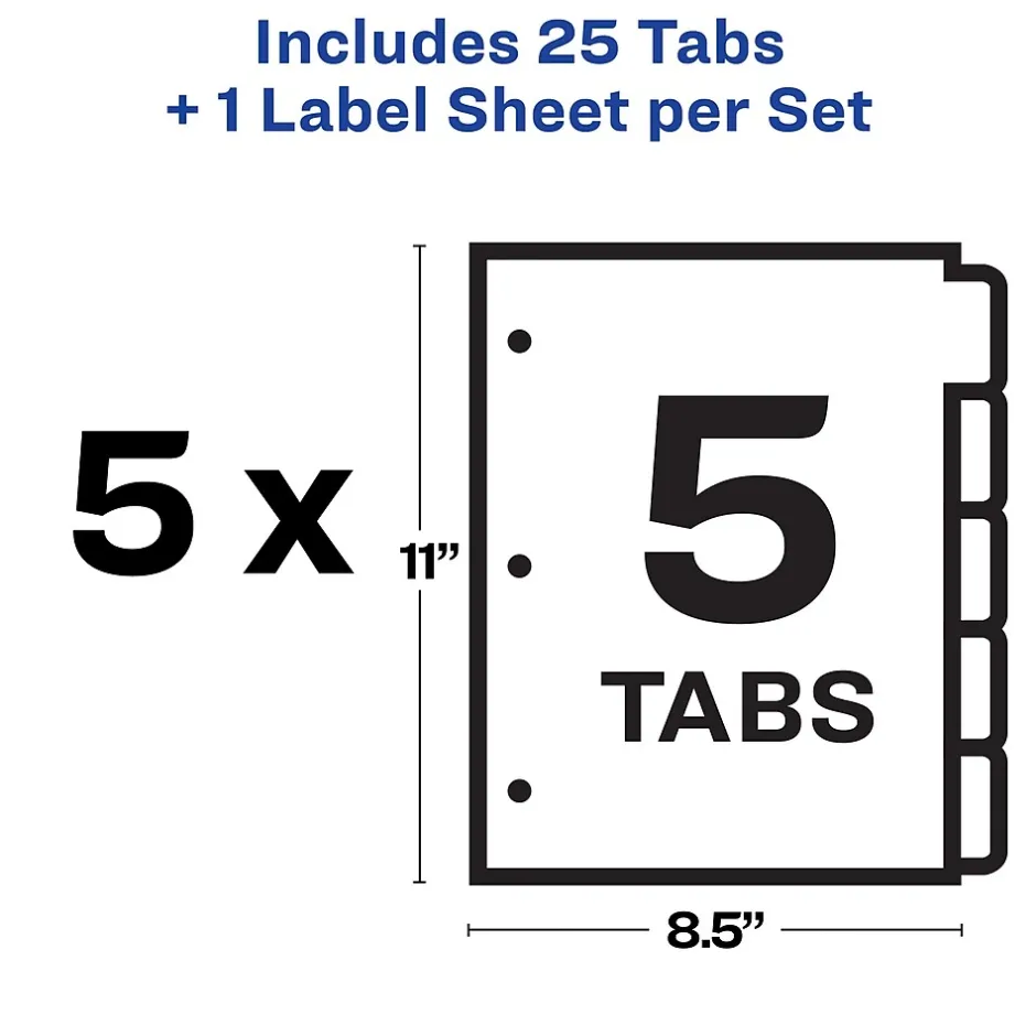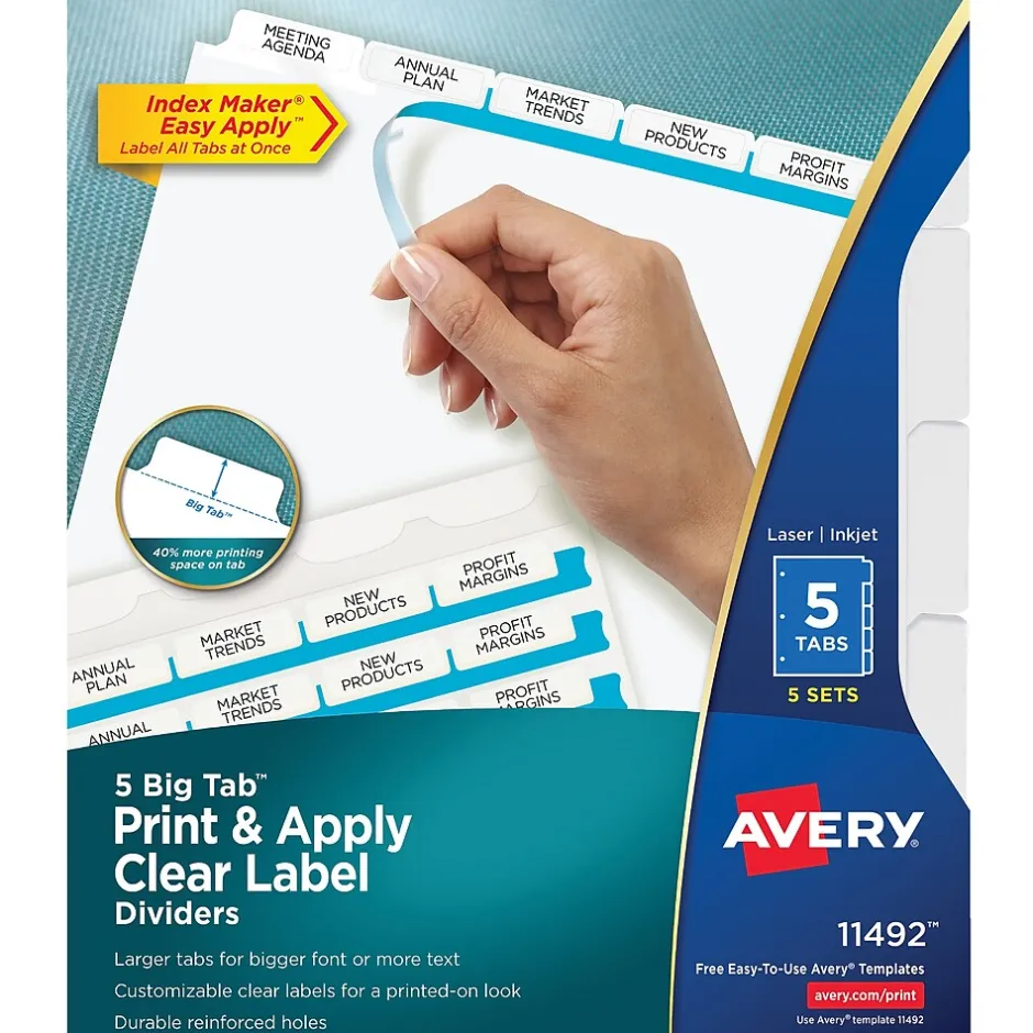 Don’t waste time and money ordering custom printed binder dividers with tabs when you can easily create and print your own personalized dividers with Avery Index Maker Clear Label Big Tab Dividers. Our larger Big Tab design offers more room for bigger fonts, more text and even logos or images. Customize your title tabs quickly and easily using the free templates on the Avery website and print with your inkjet or laser printer for clean, professional looking results in minutes. This pack comes with 5 sets of 5-tab dividers, and the Easy Apply clear label strips make it simple to apply all 5 labels of each set at once. Just print, align labels against tabs, smooth down labels and peel up strip. Each 3-hole punched durable divider also features doubled-sided, reinforced tabs and edges to help resist tearing for long-lasting, everyday use. These 3 ring binder dividers with tabs are a great addition to your medical office supplies, school binders, personal organizers, tax office supplies, presentation reports and more. Print, peel, and press your way to a perfect, precise project.