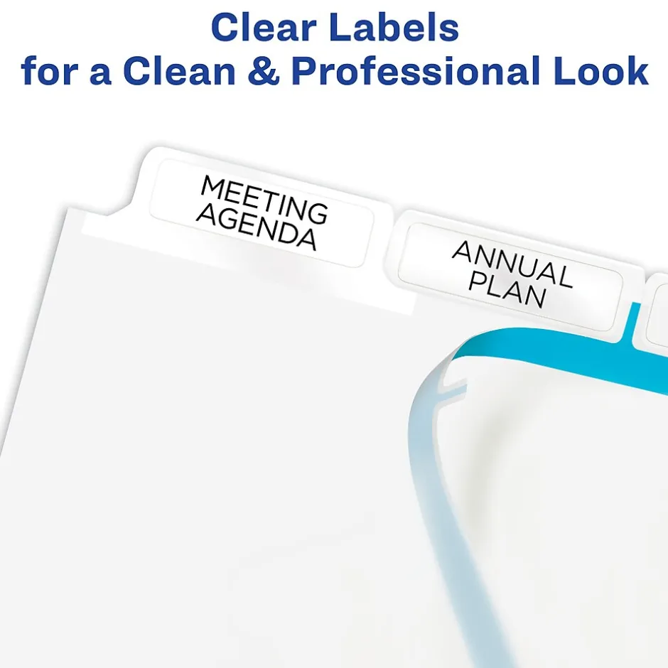 - Get a professional, printed-on look with clear labels that virtually disappear on the white divider tabs