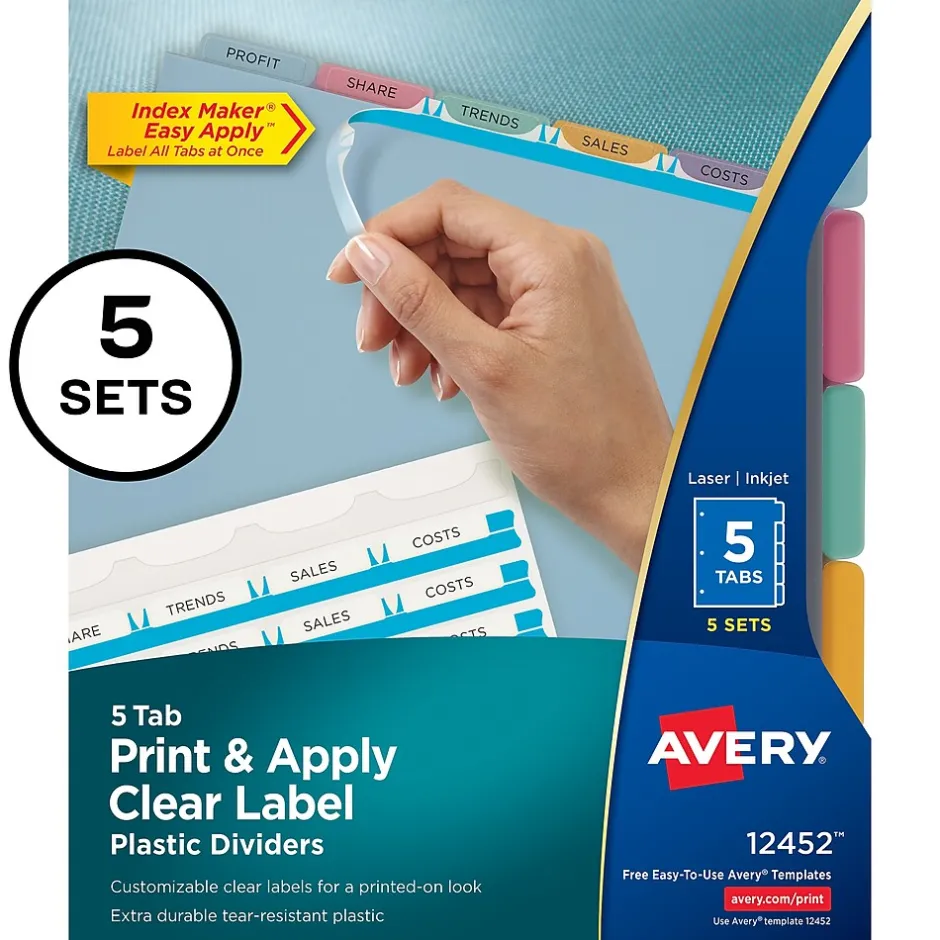 Don’t waste time and money ordering custom printed binder dividers with tabs when you can easily create and print your own personalized dividers with Avery Index Maker Clear Label Dividers. Customize your title tabs quickly and easily using the free templates on the Avery website and print with your inkjet or laser printer for clean, professional looking results in minutes. This pack comes with 5 sets of 5-tab dividers, and the Easy Apply clear label strips make it simple to apply all 5 labels of each set at once. Just print, align labels against tabs, smooth down labels and peel up strip. The white binder dividers feature an assortment of colored tabs for eye-catching convenience when you’re looking for the right section. Each 3-hole punched durable divider is tear resistant and provides extra strength for long-lasting, everyday use. These 3 ring binder dividers with tabs are a great addition to your medical office supplies, school binders, personal organizers, tax office supplies, presentation reports and more. Print, peel, and press your way to a perfect, precise project.