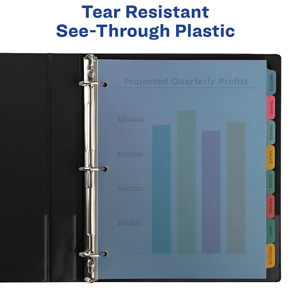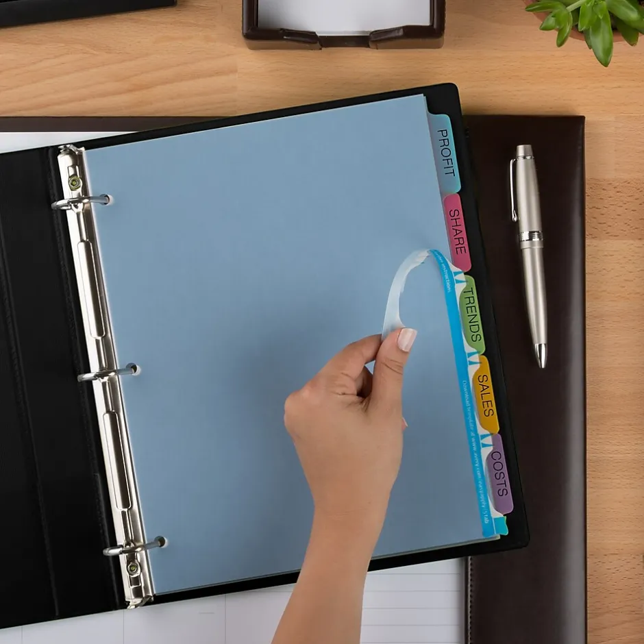 - Get a professional, printed-on look with clear labels that virtually disappear on the multicolored divider tabs