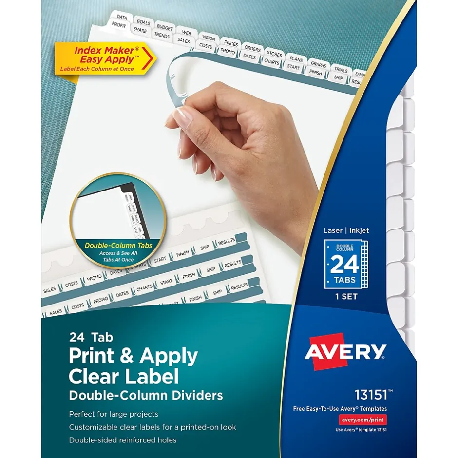 Whether you’re putting together a single project or multiple sets, these dividers let you to get it done quickly and easily, with professional results. They feature an innovative double-layer tab format that is easy to view and access. They’re ideal for large projects, training and reference manuals, policies and procedure manuals, budget binders and client binders where multiple tabs needed. The clear labels virtually disappear on the tabs, giving your dividers a clean, printed-on look. The Easy Apply strip lets you label all the tabs at once, making it simple to create custom dividers right from your computer. Just use the free templates at avery.com/print to easily personalize and print your tab labels in minutes.