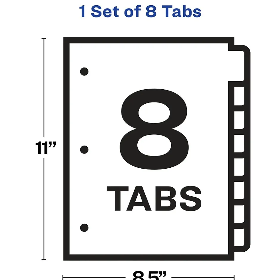 Don’t waste time and money ordering custom printed binder dividers with tabs when you can easily create and print your own personalized dividers with Avery Index Maker Clear Label Dividers. Customize your title tabs quickly and easily using the free templates on the Avery website and print with your inkjet or laser printer for clean, professional looking results in minutes. This pack comes with one set of 8-tab dividers, and the Easy Apply clear label strips make it simple to apply all 8 labels at once. Just print, align labels against tabs, smooth down labels and peel up strip. The white binder dividers feature an assortment of colored tabs for eye-catching convenience when you’re looking for the right section. Each 3-hole punched durable divider is tear resistant and provides extra strength for long-lasting, everyday use. These 3 ring binder dividers with tabs are a great addition to your medical office supplies, school binders, personal organizers, tax office supplies, presentation reports and more. Print, peel, and press your way to a perfect, precise project.