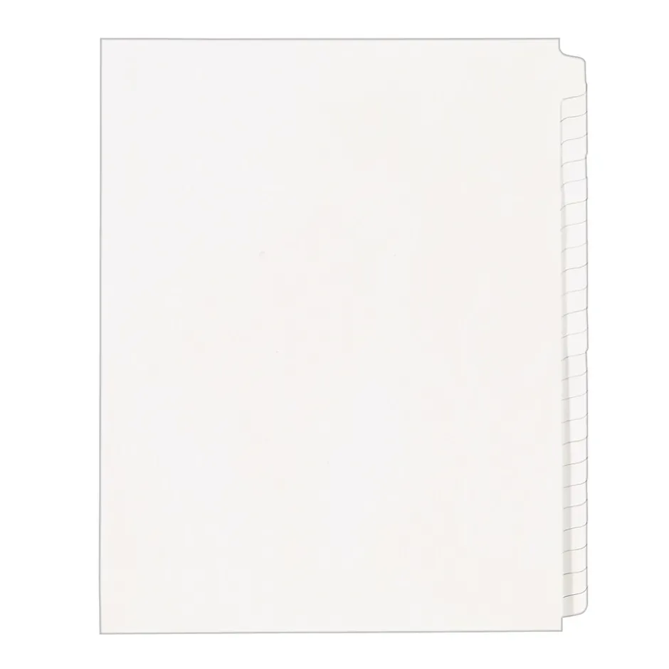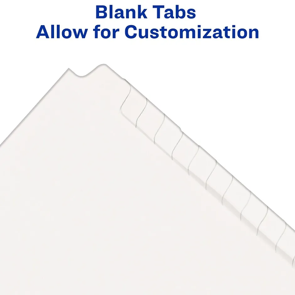 Index briefs, legal exhibits, mortgage documentation files and more. Use Avery 11959 Blank Tab Legal Exhibit Binder Dividers alone or combine with preprinted legal exhibit index dividers for easy customization of your documents. Blank, unlaminated tabs on white paper stock. You can write directly on the white tabs with a ballpoint pen or pencil, and erase easily when you’re ready to reuse and repurpose your tab dividers for the next project. The binding edge is unpunched so these dividers can fit practically any binding system. Pack contains one Standard Collated 25-Tab set.