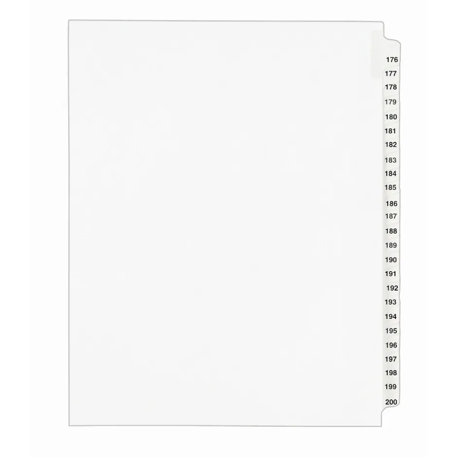 You have the right to organized and professional-looking files. This Standard Collated Legal Divider Set features Tabs 176-200 so it’s perfect for index briefs, legal exhibits, mortgage documentation files and more. White paper stock with clear, Rip Proof(TM) reinforced tabs are preprinted on both sides using Helvetica bold type for ease of use, and the unpunched binding edge gives you the freedom to fit practically any binding system. Here’s evidence these dividers will do your files justice.