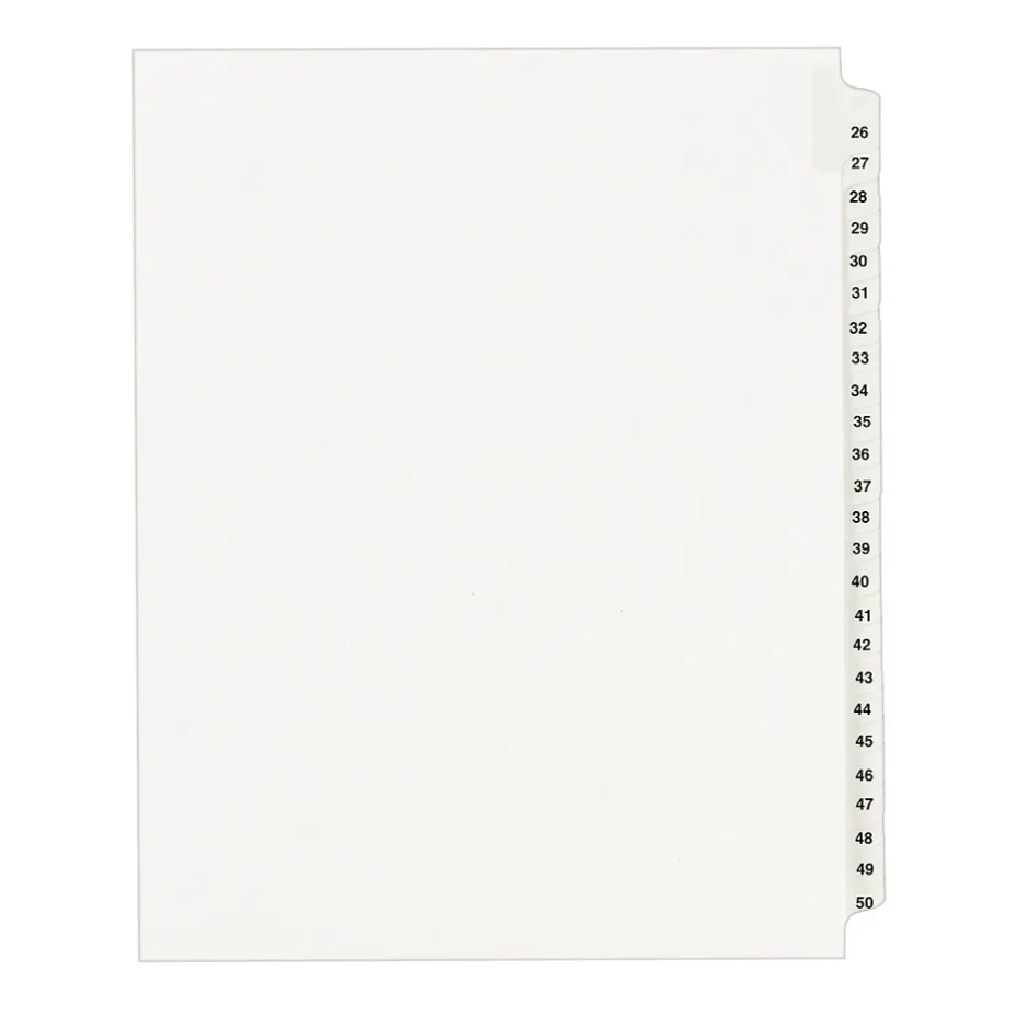 You have the right to organized and professional-looking files. This Standard Collated Legal Divider Set features Tabs 26-50 so it’s perfect for index briefs, legal exhibits, mortgage documentation files and more. White paper stock with clear, Rip Proof(TM) reinforced tabs are preprinted on both sides using Helvetica bold type for ease of use, and the unpunched binding edge gives you the freedom to fit practically any binding system. Here’s evidence these dividers will do your files justice.