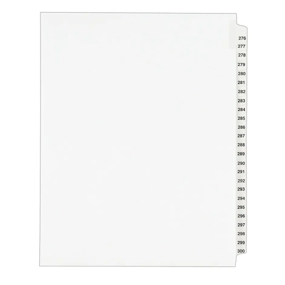 You have the right to organized and professional-looking files. This Standard Collated Legal Divider Set features Tabs 276-300 so it’s perfect for index briefs, legal exhibits, mortgage documentation files and more. White paper stock with clear, Rip Proof(TM) reinforced tabs are preprinted on both sides using Helvetica bold type for ease of use, and the unpunched binding edge gives you the freedom to fit practically any binding system. Here’s evidence these dividers will do your files justice.