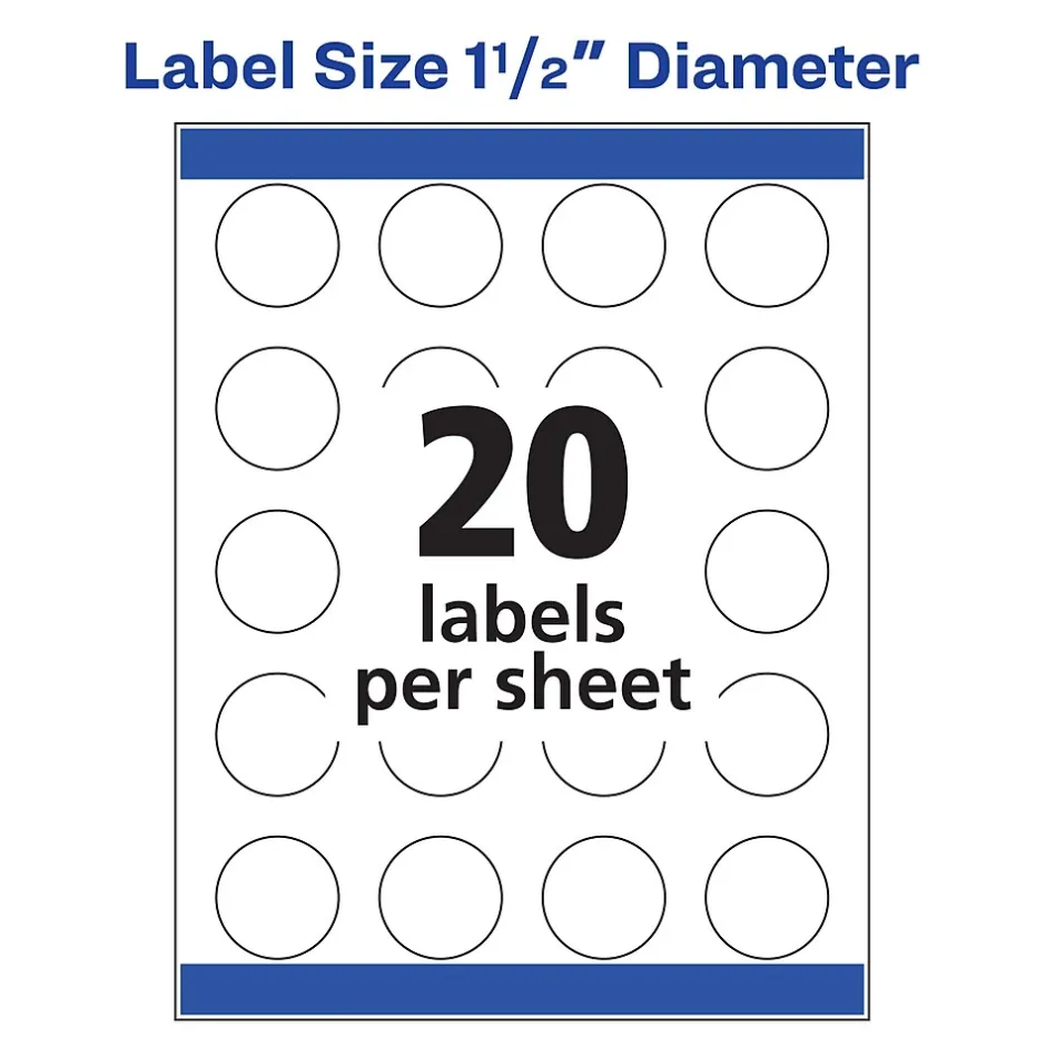 Versatile labels provide the freedom needed for nearly any project. Design and print engaging round labels for your project with Avery Matte White Labels. The multipurpose labels can grip and stick to nearly any surface with the permanent adhesive hold. Create beautiful customizable sticker labels with full-bleed backgrounds as the print-to-the-edge feature allows you to print vivid color and sharp text beyond the cutting edge. Create and personalize professional-looking, printable labels with the thousands of free designs and templates at avery.com/templates.Printable Avery labels with patented Sure Feed technology provide a more reliable feed through your printer, reducing misalignments and jams.Attention-grabbing labels often need more than a catchy phrase or design. The attractive white matte finish helps you create those eye-catching round labels needed for any project. Customize the versatile circle stickers and create popsocket stickers, envelope labels, mailing labels, gift labels, and jar labels. The round labels are sized at 1-1/2″ in diameter. The pack includes 400 individual circle sticker labels. The label sheets are measured at 8-1/2″ x 11″.