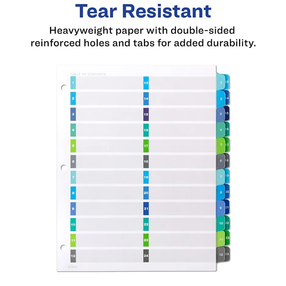 Created for big projects, Avery Ready Index Double Column Dividers are just what you need to organize your most complicated events. Each tab is preprinted and uniquely color coded for a professional appearance. Print your own custom section titles and images onto the table of contents sheet without worrying about labels or inserts. Whether you’re creating planners for classes or hosting a presentation, these dividers are ideal for getting everything sorted. 24 dividers are included with each sheet measuring 8-1/2″x11″.The first column of tabs is 1/2″ long with the second column of tabs measuring 3/4″ to create a layered layout that is easier to read. The 3 binder holes are reinforced on both sides of the heavyweight sheet to prevent creasing and tearing.Each divider tab includes additional reinforcement along the edge of each page to distribute stress and resist folding. The printable table of contents is dual compatible with both laser and inkjet printers. Try out free templates for these dividers and check out the Avery Design & Print software at avery.com/templates.