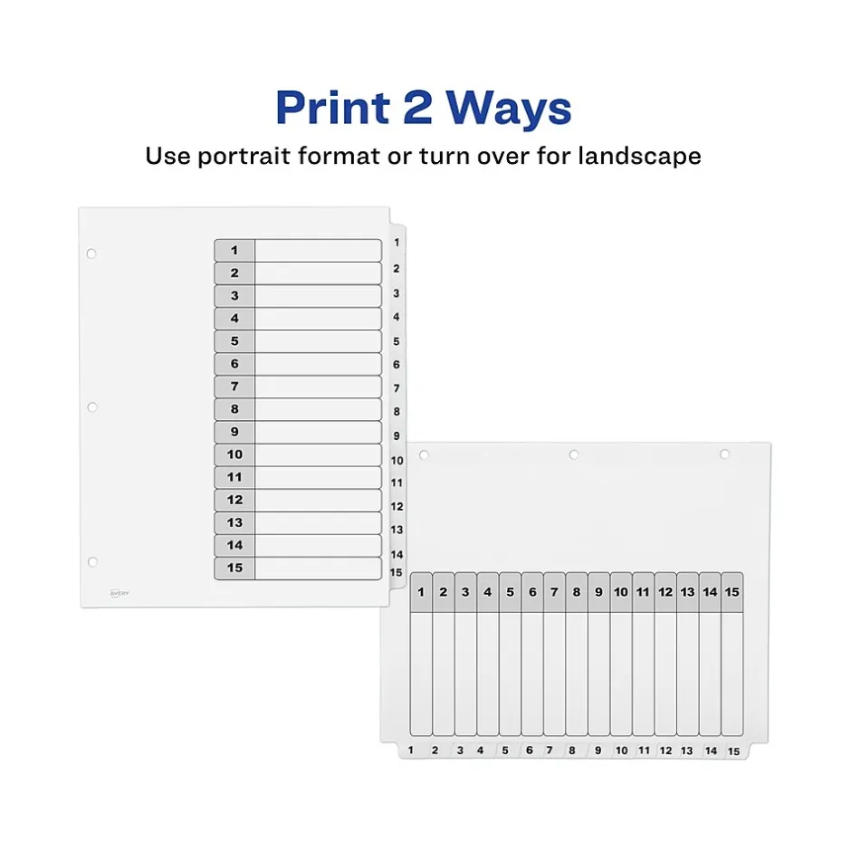 Organize your projects in moments with Avery Ready Index binder dividers. Each white tab is preprinted for a professional appearance. Print your own custom section titles and images onto the table of contents sheet without worrying about labels or inserts. Whether you’re creating planners for classes or hosting a presentation, these dividers are ideal for getting everything sorted.6 sets of 12 dividers are included with each sheet measuring 8-1/2″x11″. The 3 binder holes are reinforced on both sides of the heavyweight sheet to prevent creasing and tearing. Each divider tab includes additional reinforcement along the edge of each page to distribute stress and resist folding.The printable table of contents is dual compatible with both laser and inkjet printers. This sheet can also be printed in either portrait or landscape so that your projects can be displayed in any orientation. Just flip the sheet to view the other layout on the opposite side. Try out free templates for these dividers and check out the Avery Design & Print software at avery.com/templates