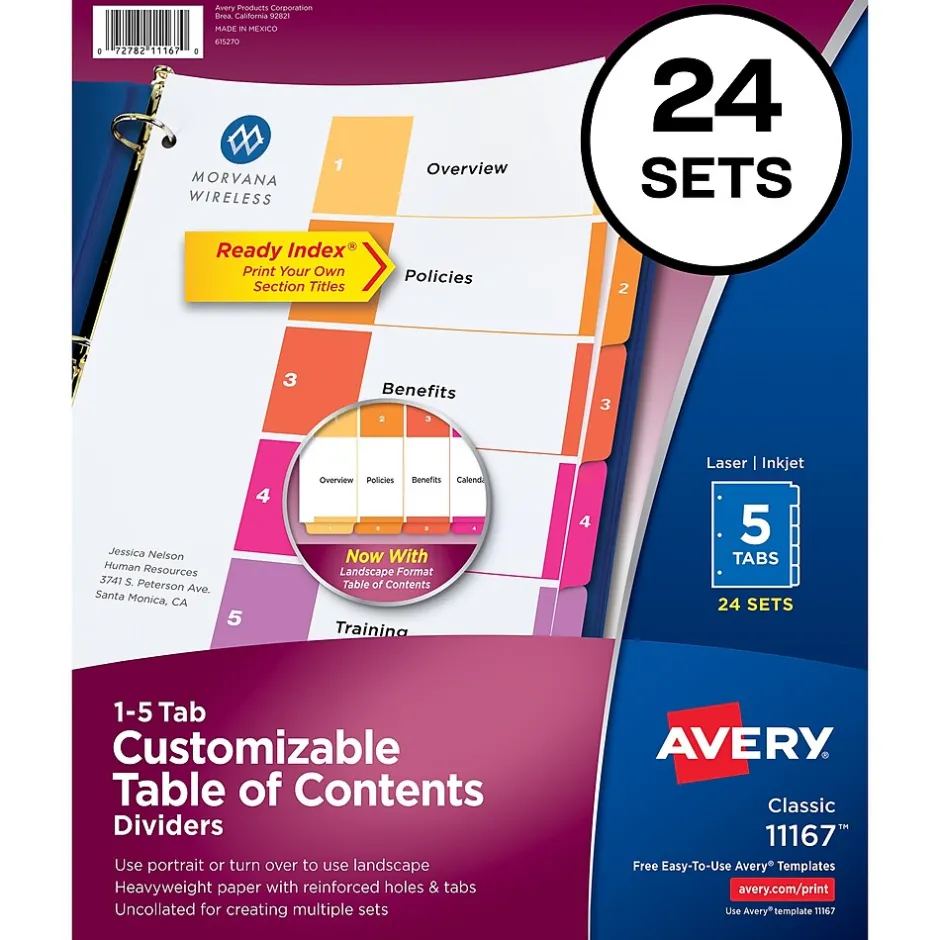 Organize your projects in moments with Avery Ready Index 5-tab dividers.Each tab is preprinted and uniquely color coded for a professional appearance. Print your own custom section titles and images onto the table of contents sheet without worrying about labels or inserts. Whether you’re creating planners for classes or hosting a presentation, these dividers are ideal for getting everything sorted.24 sets of 5 tabbed dividers are included with each sheet measuring 8-1/2″x11″.The 3 binder holes are reinforced on both sides of the heavyweight sheet to prevent creasing and tearing. Each divider tab includes additional reinforcement along the edge of each page to distribute stress and resist folding.The printable table of contents is dual compatible with both laser and inkjet printers. This sheet can also be printed in either portrait or landscape so that your projects can be displayed in any orientation. Just flip the sheet to view the other layout on the opposite side. Try out free templates for these dividers and check out the Avery Design & Print software at avery.com/templates.