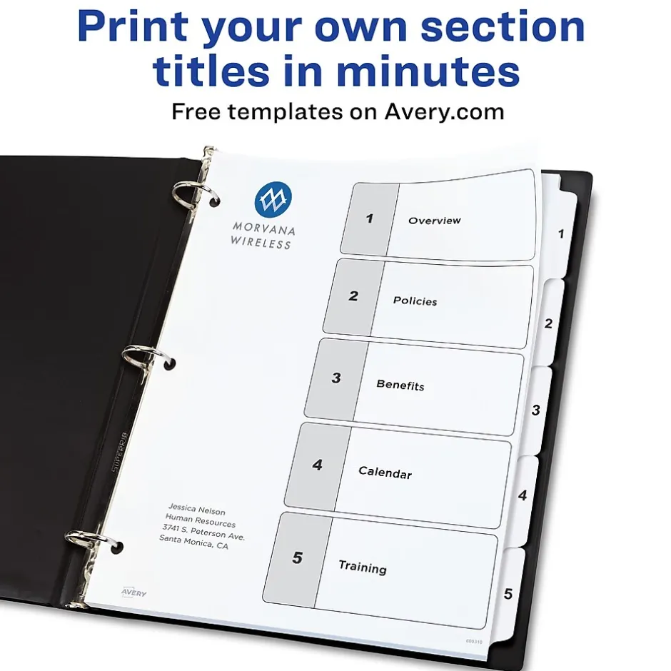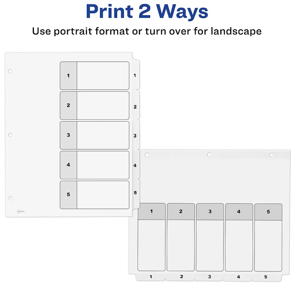 Organize your projects in moments with Avery Ready Index binder dividers.Each white tab is preprinted for a professional appearance. Print your own custom section titles and images onto the table of contents sheet without worrying about labels or inserts. Whether you’re creating planners for classes or hosting a presentation, these dividers are ideal for getting everything sorted.6 sets of 5 dividers are included with each sheet measuring 8-1/2″x11″. The 3 binder holes are reinforced on both sides of the heavyweight sheet to prevent creasing and tearing. Each divider tab includes additional reinforcement along the edge of each page to distribute stress and resist folding.The printable table of contents is dual compatible with both laser and inkjet printers.This sheet can also be printed in either portrait or landscape so that your projects can be displayed in any orientation.Just flip the sheet to view the other layout on the opposite side.Try out free templates for these dividers and check out the Avery Design & Print software at avery.com/templates