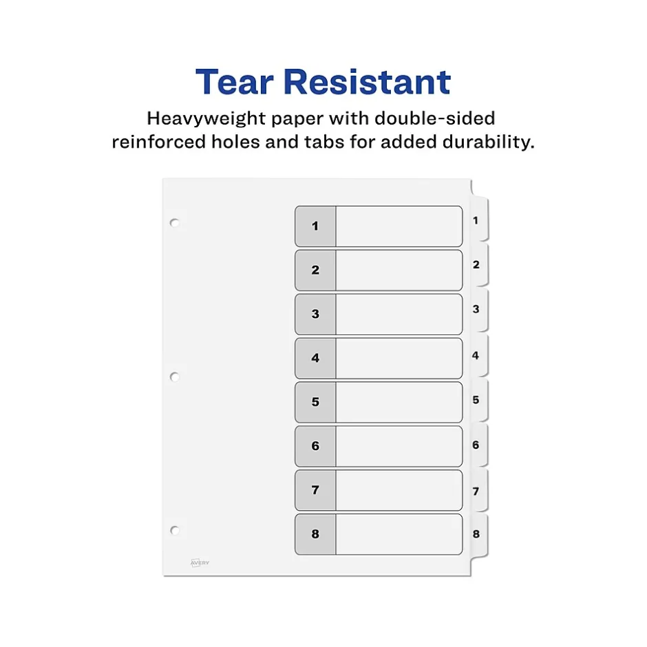 Organize your projects in moments with Avery Ready Index A-Z dividers.Each tab is preprinted and uniquely color coded for a professional appearance. Print your own custom section titles and images onto the table of contents sheet without worrying about labels or inserts. Whether you’re creating planners for classes or hosting a presentation, these dividers are ideal for getting everything sorted.6 sets of 26 alphabet dividers are included with each sheet measuring 8-1/2″x11″. The 3 binder holes are reinforced on both sides of the heavyweight sheet to prevent creasing and tearing. Each divider tab includes additional reinforcement along the edge of each page to distribute stress and resist folding.The printable table of contents is dual compatible with both laser and inkjet printers. This sheet can also be printed in either portrait or landscape so that your projects can be displayed in any orientation. Just flip the sheet to view the other layout on the opposite side. Try out free templates for these dividers and check out the Avery Design & Print software at avery.com/templates.