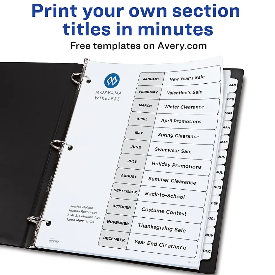 Organize your projects in moments with Avery Ready Index binder dividers. Each Jan-Dec white tab is preprinted for a professional appearance. Print your own custom section titles and images onto the table of contents sheet without worrying about labels or inserts. Whether you’re creating planners for classes or hosting a presentation, these dividers are ideal for getting everything sorted.1 set of 12 dividers are included with each sheet measuring 8-1/2″x11″.The 3 binder holes are reinforced on both sides of the heavyweight sheet to prevent creasing and tearing. Each monthly divider tab includes additional reinforcement along the edge of each page to distribute stress and resist folding.The printable table of contents is dual compatible with both laser and inkjet printers. This sheet can also be printed in either portrait or landscape so that your projects can be displayed in any orientation. Just flip the sheet to view the other layout on the opposite side. Try out free templates for these dividers and check out the Avery Design & Print software at avery.com/templates.