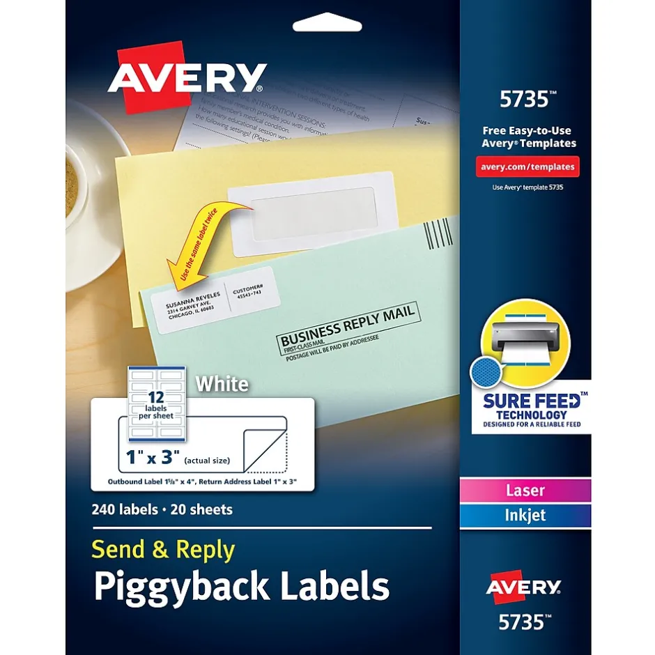 Make it easy for recipients to respond with Avery(R) Send & Reply Piggyback Labels. The white printable labels can be used as an address label, then peeled off and used as a return address label, all in one. These adhesive shipping labels made with FSC(R) certified paper are convenient for returning packages, replying to invitations and responding to questionnaires. Sure Feed(R) technology label sheets provide a reliable feed through your printer, reducing misalignments and jams. Create custom shipping labels with free templates and designs at avery.com/templates. Just print from a laser or inkjet printer, and peel and stick.