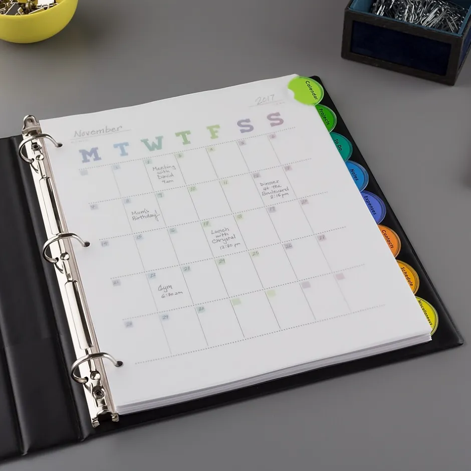 - Find sections quickly and easily with the translucent, clear tabbed dividers featuring bright, multicolor tabs
