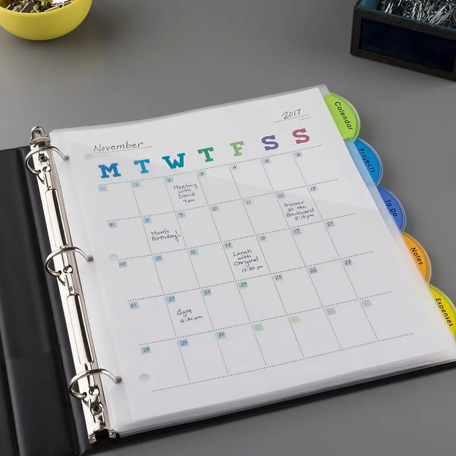 - Store loose papers and unpunched sheets within the front pocket of each 5-tab binder dividers