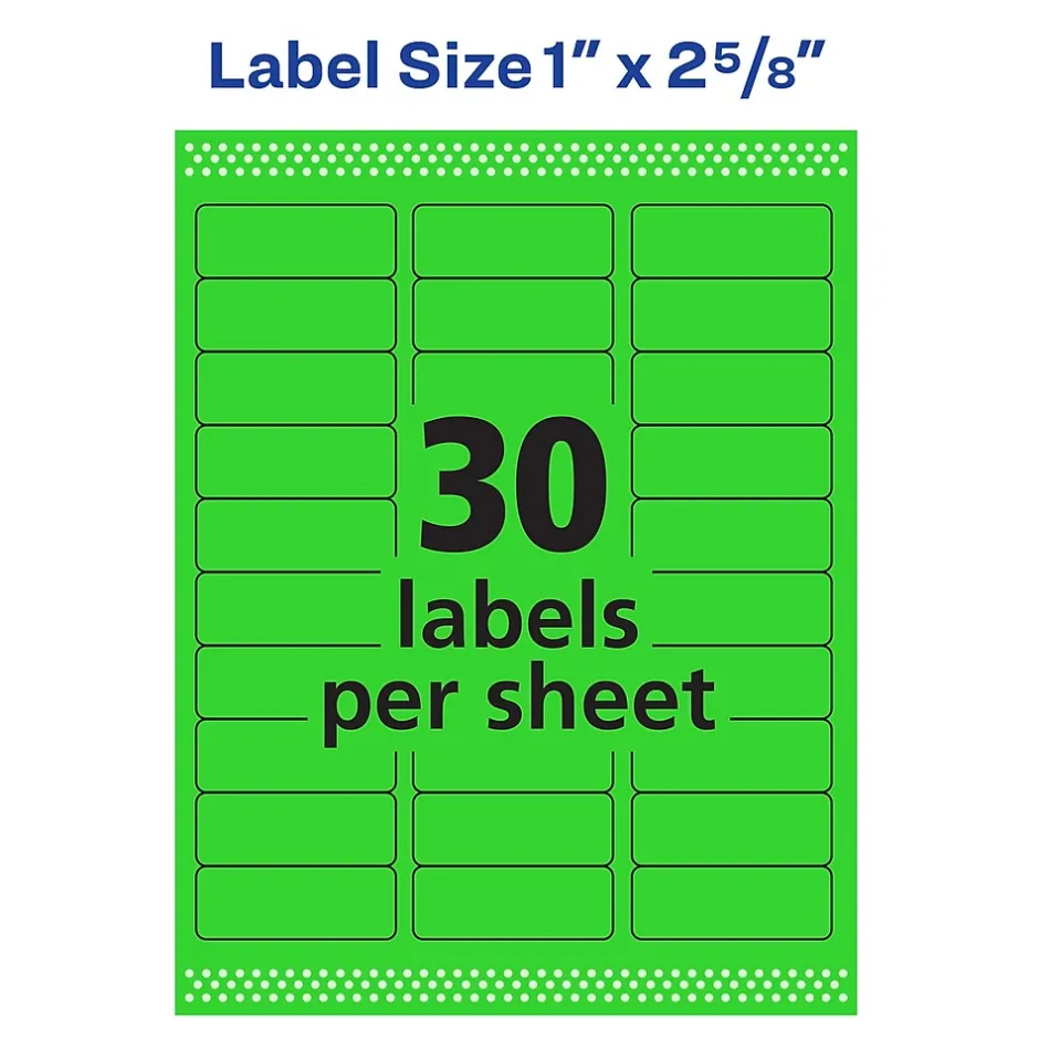 Create eye-catching printable color labels and make your next project or shipment stand out with Avery Neon Green Address Labels for Laser Printers. Having engaging labels with attention-grabbing colors can provide the additional appeal needed for any catchy phrase. Whether you’re creating Identification labels or envelope labels, these bright color labels can help capture your audience’s attention. Easily design and personalize your unique printable labels with the thousands of free designs and templates at avery.com/templates. For long lasting hold on any surface, these strong stick 1″ x 2 5/8″ fluorescent green neon labels are designed with a permanent adhesive. Expect high-quality, smudge free printing results with these laser printer optimized neon stickers. Prevent jams and misalignments during the printing process using Avery Sure Feed(R) technology.