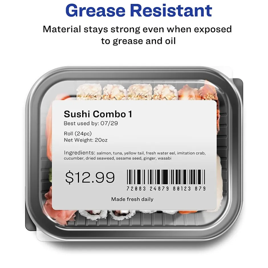 - Water resistant label material also resists scratches, smudges and grease staying legible through any labeling project