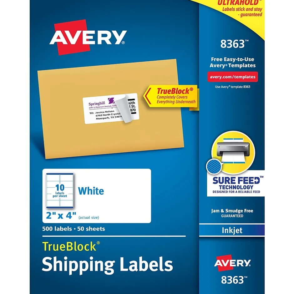 Create custom labels for gifts, crafts, party favors or parcels with this 500-box of Avery shipping labels. The TrueBlock technology covers and conceals the underlying surface so you can reuse boxes or correct mistakes, and the permanent adhesive secures labels in place. These Avery shipping labels are compatible with inkjet printers to let you add bright colors, graphics, logos or sharp, clear text to labels. These labels also feature exclusive Avery Sure Feed technology to improve print alignment and avoid jamming.
