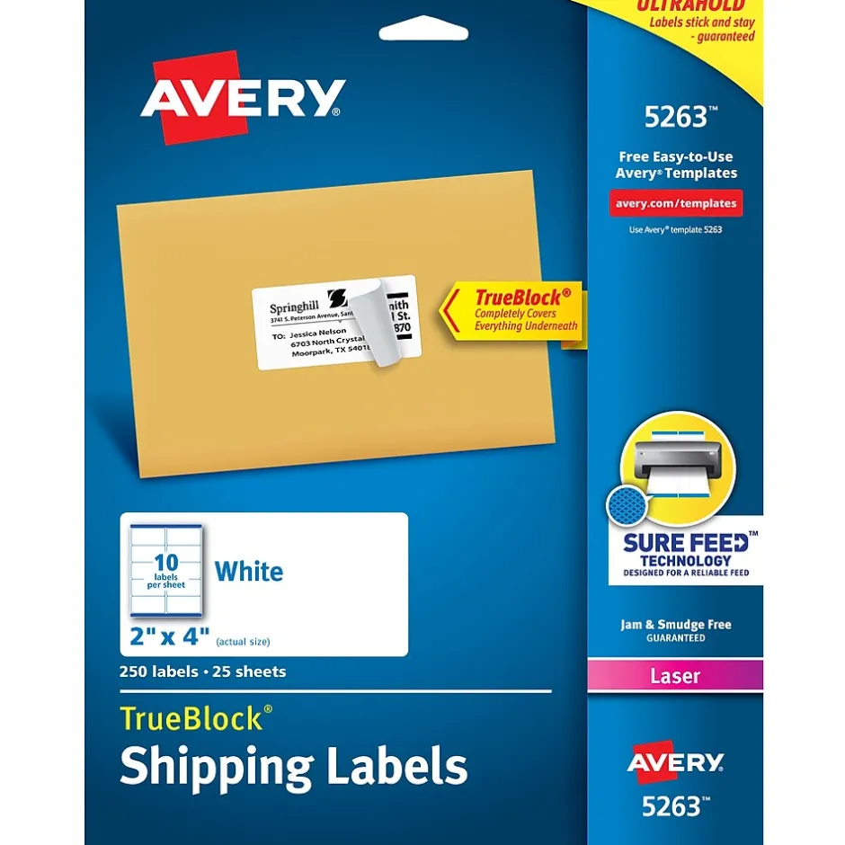 Avery laser shipping labels with TrueBlock technology feature clean edges and arrive on smooth feed sheets so that you can print multiple labels without a printer jam. The bright white background contrasts with black ink, making the text easy to read, while the durable construction withstands the mailing process. Designed for use with laser printers, these customizable labels let you add your company logo or graphics for a professional, stand-out appearance, and the Easy Peel design protects the strong adhesive until you’re ready to apply the labels. These labels also feature exclusive Avery Sure Feed technology to improve print alignment and avoid jamming.