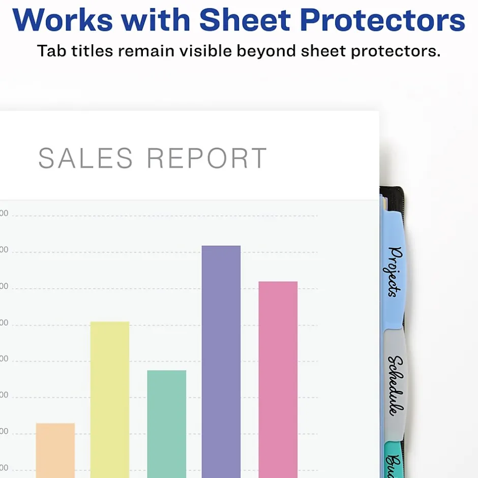 - Tab titles remain visible with tabs that extend beyond sheet protectors