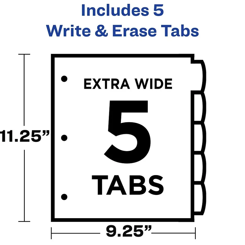 - Find sections quickly and easily with the brightly colored 5-tab binder dividers