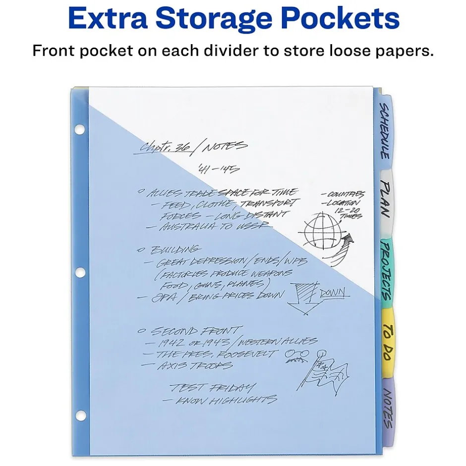 Write, erase and reuse these Avery 5-Tab Write & Erase Pocket Dividers to your heart’s content. The wide design works perfectly with sheet protectors so that you can still view your tabs at a glance. Each 3 ring binder divider is made of durable, tear-resistant PVC-free plastic designed to hold up to frequent referencing. Write directly on the multicolor divider tabs with a ballpoint pen or pencil, and erase when you’re ready to repurpose your page divider for the next project. The front pocket in each plastic divider is perfect for storing your loose, unpunched or smaller sized sheets, photos and documents. Each divider in this 5-tab set features a fun pastel color that is sure to stand out when you open your binder, and is perfect for color coding and quick identification. Tabbed dividers are 3-hole punched and ready for immediate use in standard 3 ring binders. This set of 5 write-on binder dividers is great for homework organization, personal finance planning, recipe binder dividers, as a coupon organizer, or anything else that needs sorting.
