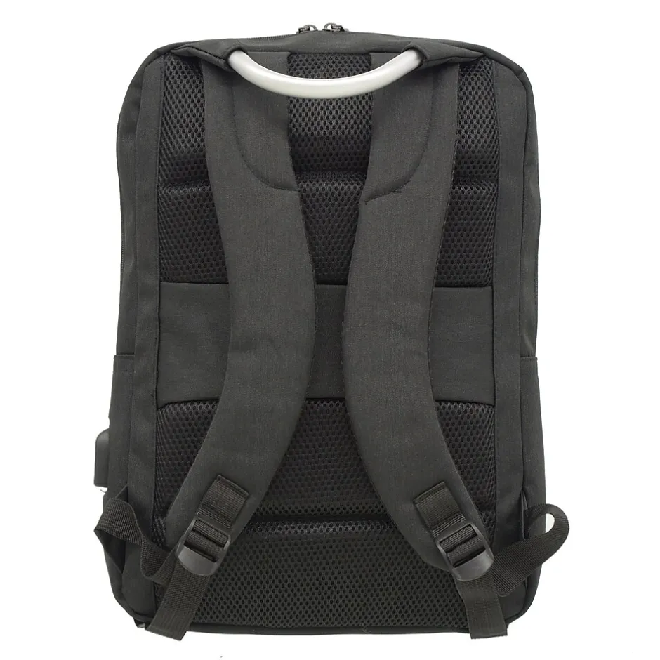 This smart backpack from Club Rochelier features 3 zippered compartments for better organization. Small front pocket stores smaller accessories like your iPad or cell phone. Second zipper pocket is spacious enough for your tablet and sports classification pockets for more organized storage. Main compartment features a secure laptop pocket and a hidden zippered compartment with USB cable and USB/Headphone ports. Comfortable padded backpack straps and Trolley strap makes this bag perfect for the business traveler or busy student.