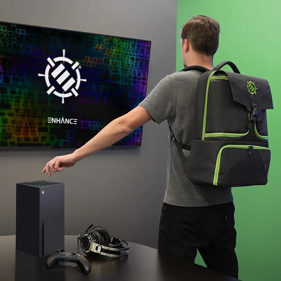 ENHANCE Gaming’s gaming backpack offers a portable gaming arsenal with a sleek modern style that is both practical and eye-catching. The all-new gaming bag was designed specifically for several models of the Xbox including Xbox Series X and Series S. This gaming backpack offers an incredible bottom storage compartment for either model. Store all of your gaming gear from controllers, battery packs, cables, charging stations, discs.