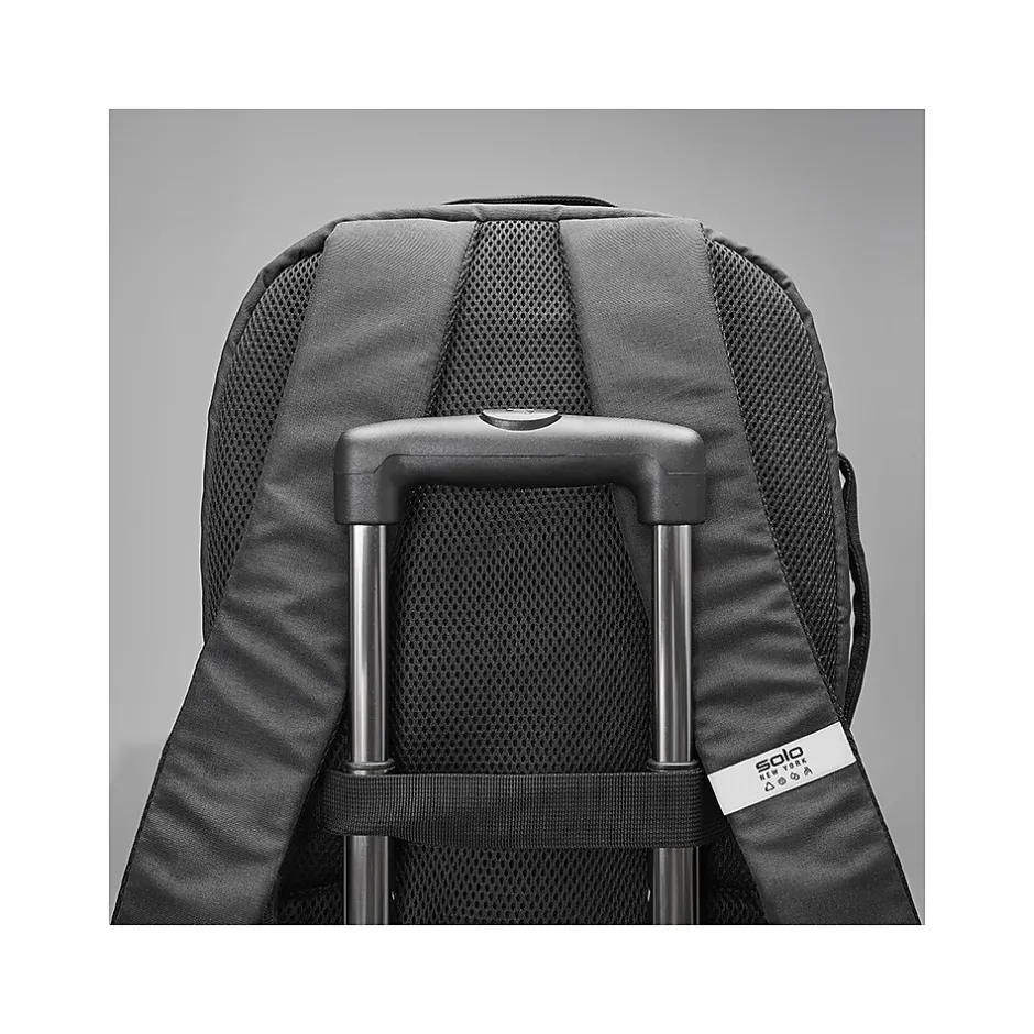 - This laptop backpack makes travel with electronics simple; made of recycled PET polyester in black