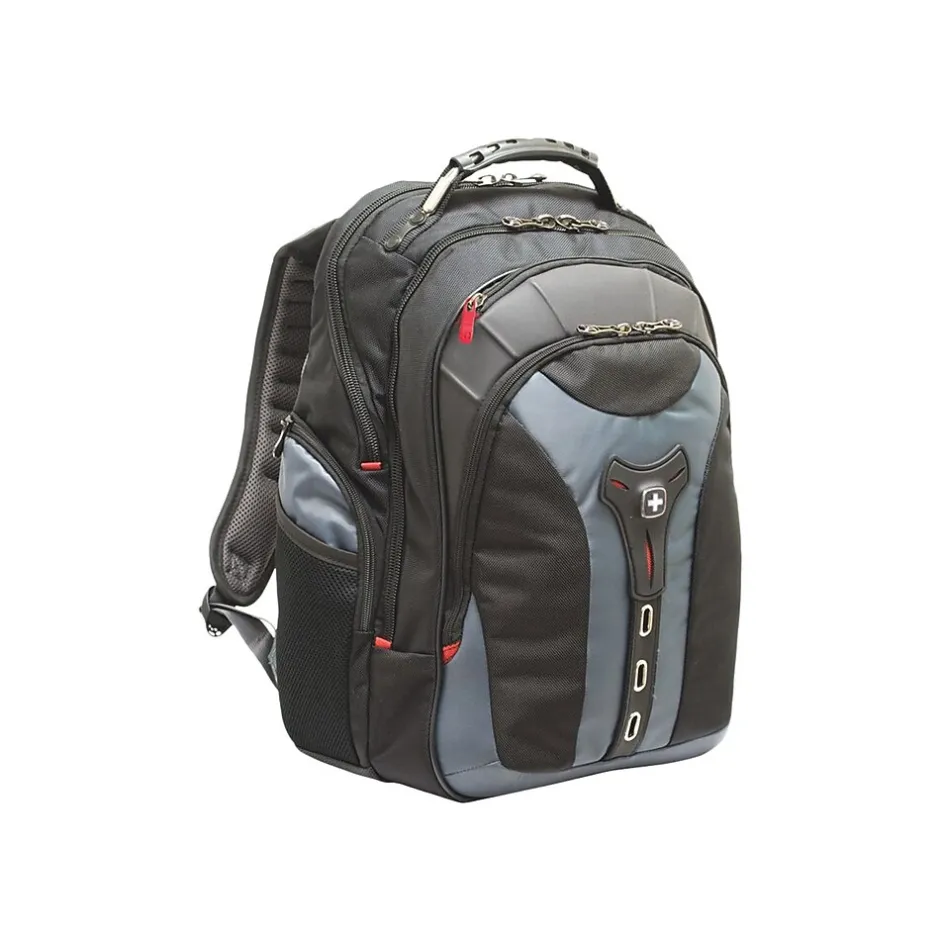 Gear up for your daily commute with this laptop backpack. The spacious main compartment offers protection and storage for your laptop and other work essentials, while a removable accessory pouch keeps small items grouped together. A quick access pocket provides the perfect place to stash keys, passports, and tickets, so you can grab frequently needed items fast. This laptop boasts ballistic nylon construction to withstand the rigors of regular travel, and the shock-absorbing shoulder straps and airflow back padding offer added comfort as you race to a train platform or airport terminal. Featuring a dual-handle system, this Wenger Pegasus laptop backpack can be carried by hand or attached to a rolling suitcase.