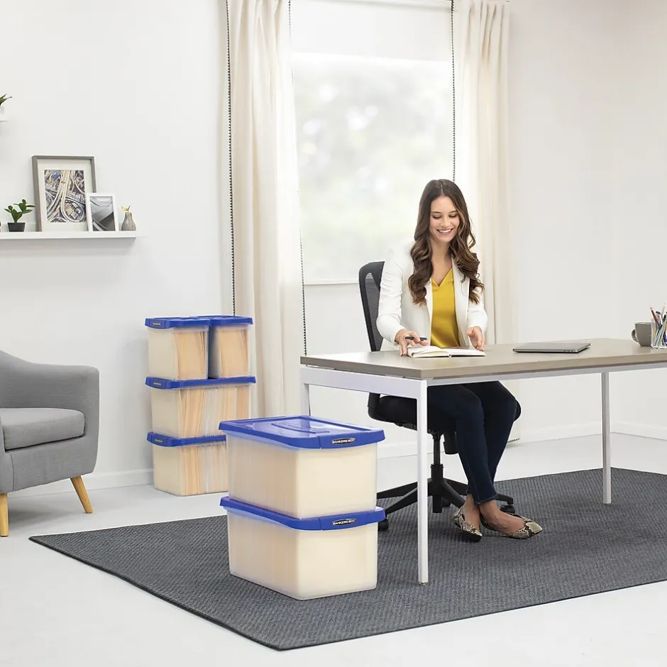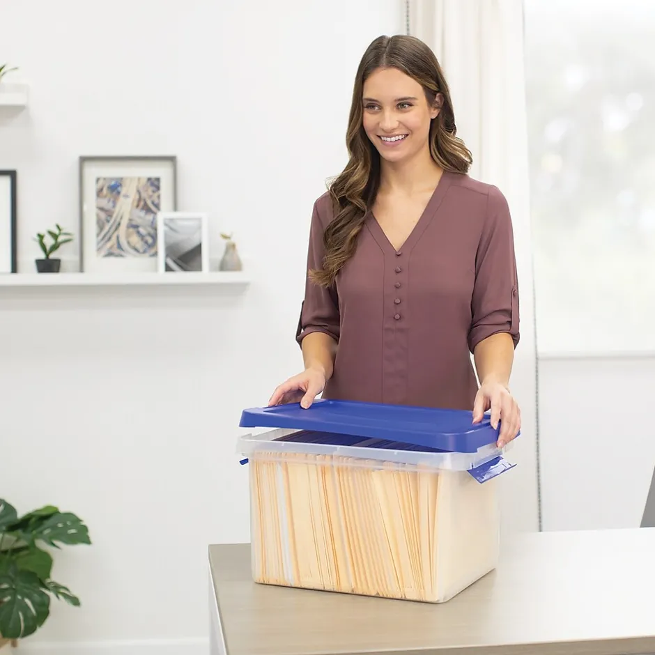 The Bankers Box plastic storage container with lid provides organized and secure storage and transport of 20″ of letter files. Durable plastic storage bin construction with reinforced corners for added strength. Modular design offers easy stackability while built-in hanging rails keep legal-size files organized and accessible. Features comfortable handles for easy lifting and locking lid for secure transport.
