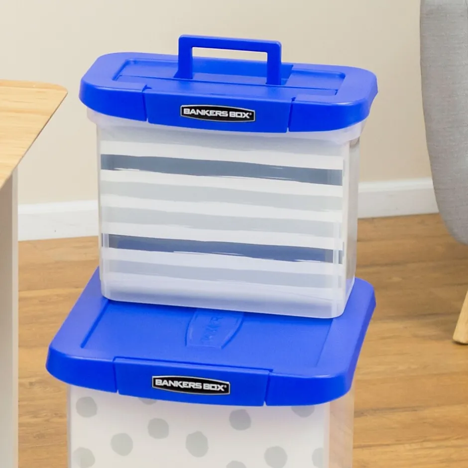 Keeping your most important files safe and organized, the Bankers Box Plastic Portable File Box offers quick transportation for documents. The letter size portable file box features reinforced corners for added strength and the modular design allows for easy stackability with the Bankers Box File Box. Built-in hanging rails provide organized access to your letter-size files and the convenient carrying handle allows for easy lifting.