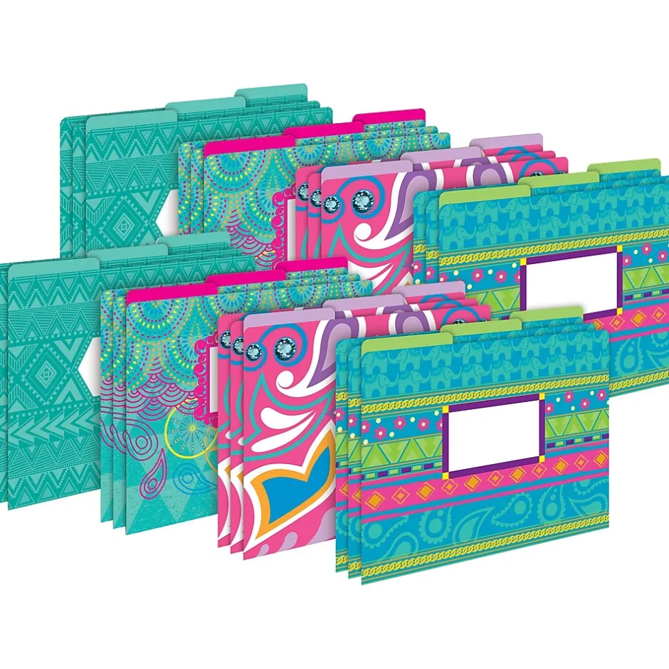 Barker Creek’s Bohemian letter-sized file folders are an affordable way to organize your office, classroom, and home with style and flair. This set of stylish desk accessories includes 24 file folders – six each of four colorful designs. The folders are 1/3 tabbed, which means that they have three tab positions – eight folders are tabbed on the left, eight folders are tabbed in the center, and eight are tabbed on the right. The 14-point stock makes these folders perfect for desktop filing, meeting handouts, and student papers.These Bohemian file folders come with a preprinted “label” on the front for adding a table of contents, highlighting meeting agendas, listing the names of team members, bulleting travel itineraries, and so much more. These unique office supplies are fully reversible, each folder having a multicolored design on one side and a vibrant, solid color on the reverse side. The possibilities are limited only by your imagination! Coordinating products are available. Search: Barker Creek Bohemian.