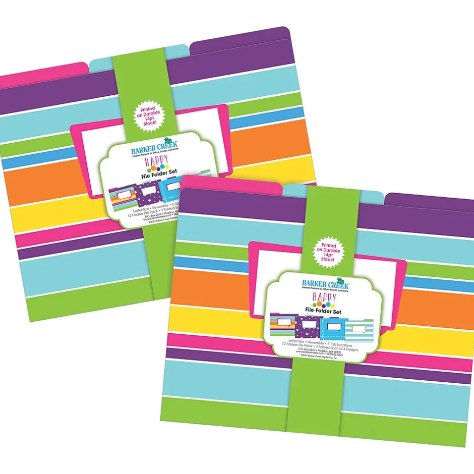 Barker Creek’s Happy Letter-Size File Folders are an affordable way to organize your office, classroom, or home with style and flair. This set of stylish desk accessories includes 24 file folders – six each of four colorful designs. The folders are 1/3 tabbed, which means that they have three tab positions – eight folders are tabbed on the left, eight folders are tabbed in the center, and eight are tabbed on the right.The 14-point stock makes these folders perfect for desktop filing, meeting handouts, and student papers. These Happy file folders come with a preprinted “label” on the front for adding a table of contents, highlighting meeting agendas, listing the names of team members, bulleting travel itineraries, and so much more. These unique office supplies are fully reversible, each folder having a multicolored design on one side and a soft, solid color on the reverse side. The possibilities are limited only by your imagination! Coordinating products are available. Search: Barker Creek Happy.