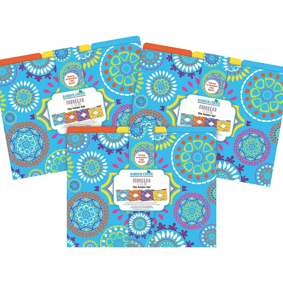Barker Creek’s Moroccan Letter-Size File Folders are an affordable way to organize your office, classroom, or home with style and flair. This set of stylish desk accessories includes 36 file folders – nine each of four colorful designs. The folders are 1/3 tabbed, which means that they have three tab positions – twelve folders are tabbed on the left, twelve folders are tabbed in the center, and twelve are tabbed on the right. The 14-point stock makes these folders perfect for desktop filing, meeting handouts, and student papers. These Moroccan file folders come with a preprinted “label” on the front for adding a table of contents, highlighting meeting agendas, listing the names of team members, bulleting travel itineraries, and so much more. These unique office supplies are fully reversible, each folder having a multicolored design on one side and a vibrant, solid color on the reverse side. The possibilities are limited only by your imagination! Coordinating products are available. Search: Barker Creek Moroccan.