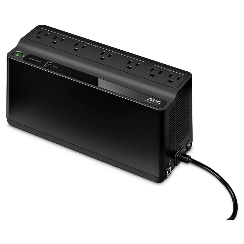 Secure a workstation with this battery backup. Up to 12 minutes of run time on half load or 3 minutes on full load lets users save work or maintain critical connections during a power flicker. The built-in USB port lets you charge a mobile device. This 330-watt rechargeable APC Back-UPS backup battery’s surge protection buffers your devices from unnecessary voltage.