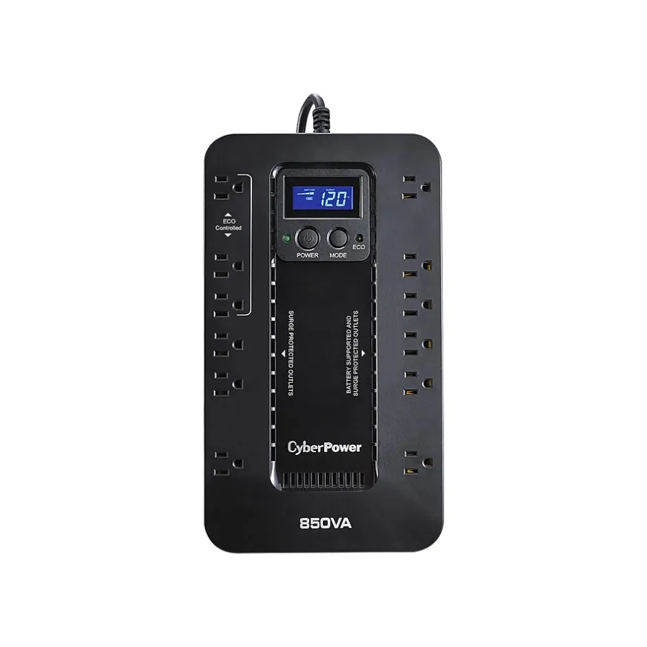 A compact UPS with standby topology, the CyberPower Ecologic EC850LCD provides battery backup (using simulated sine wave output) and surge protection for desktop computers, workstations, networking devices, and home entertainment systems. During power interruptions, the EC850LCD offers reliable power protection and battery backup. When the battery backup detects that the computer is off or in sleep mode, computer peripherals connected to the ECO Mode, surge protected outlets will be automatically turned off, reducing power usage and lowering energy costs (USB connection required). The multifunction LCD provides immediate, detailed information about the UPS battery and power conditions and generates alerts of potential problems before they can affect critical equipment and cause downtime.