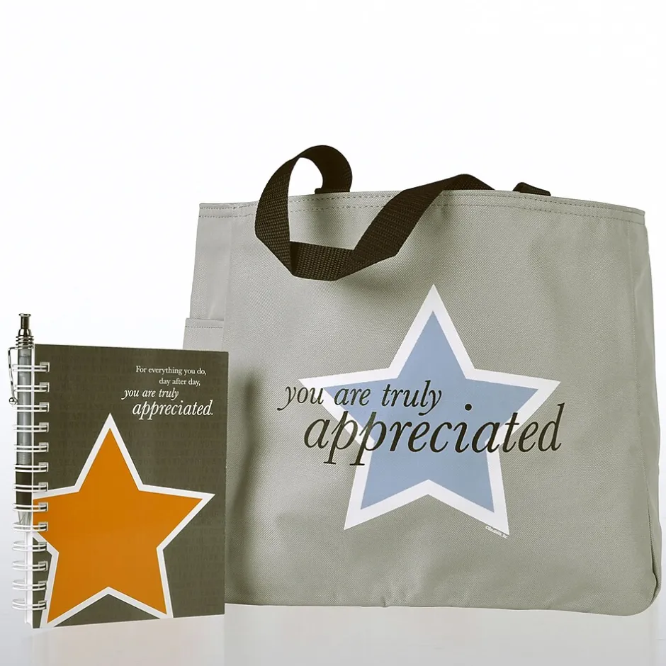 Baudville® Tote gift set has a journal of 100 pages featuring hard cover which is sleek and spiral binding. Gift set features exclusive four color art and the theme “You are Truly Appreciated” with a pen and tote made up of poly canvas material.