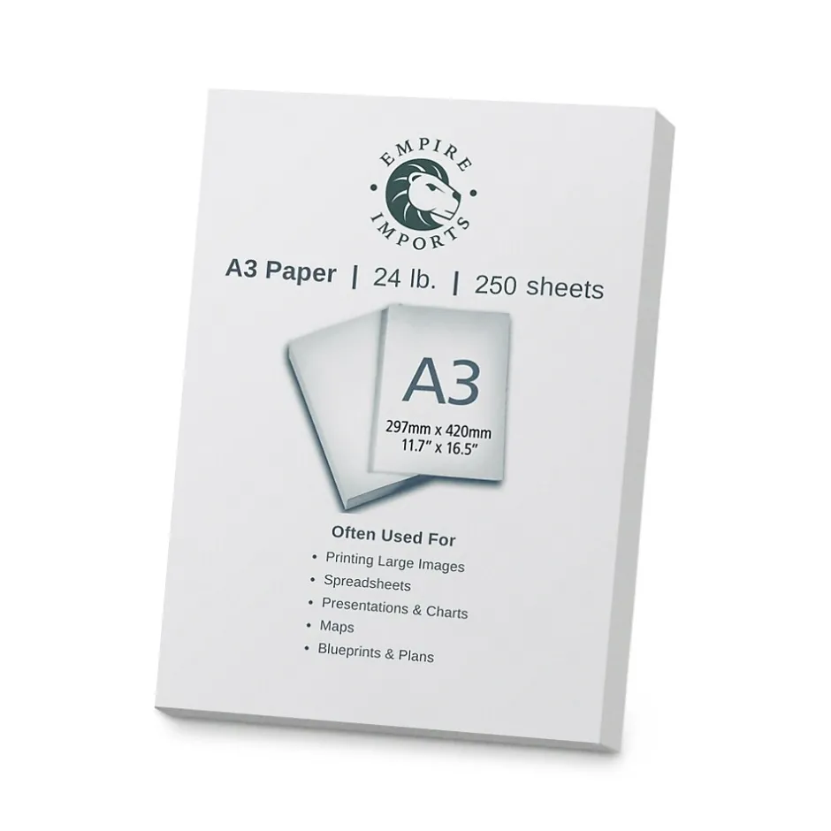 Empire Imports A3 Paper is a specialty sized paper that has a wide variety of uses. This paper is made from premium quality 24 lb. stock, and is good for professional quality projects and casual ones alike. A3 paper can be used for many purposes like large images, spreadsheets, maps and other large landscape-style needs. It also can be used for print jobs requiring a spread of two A4 sheets. Each ream contains 250 sheets.
