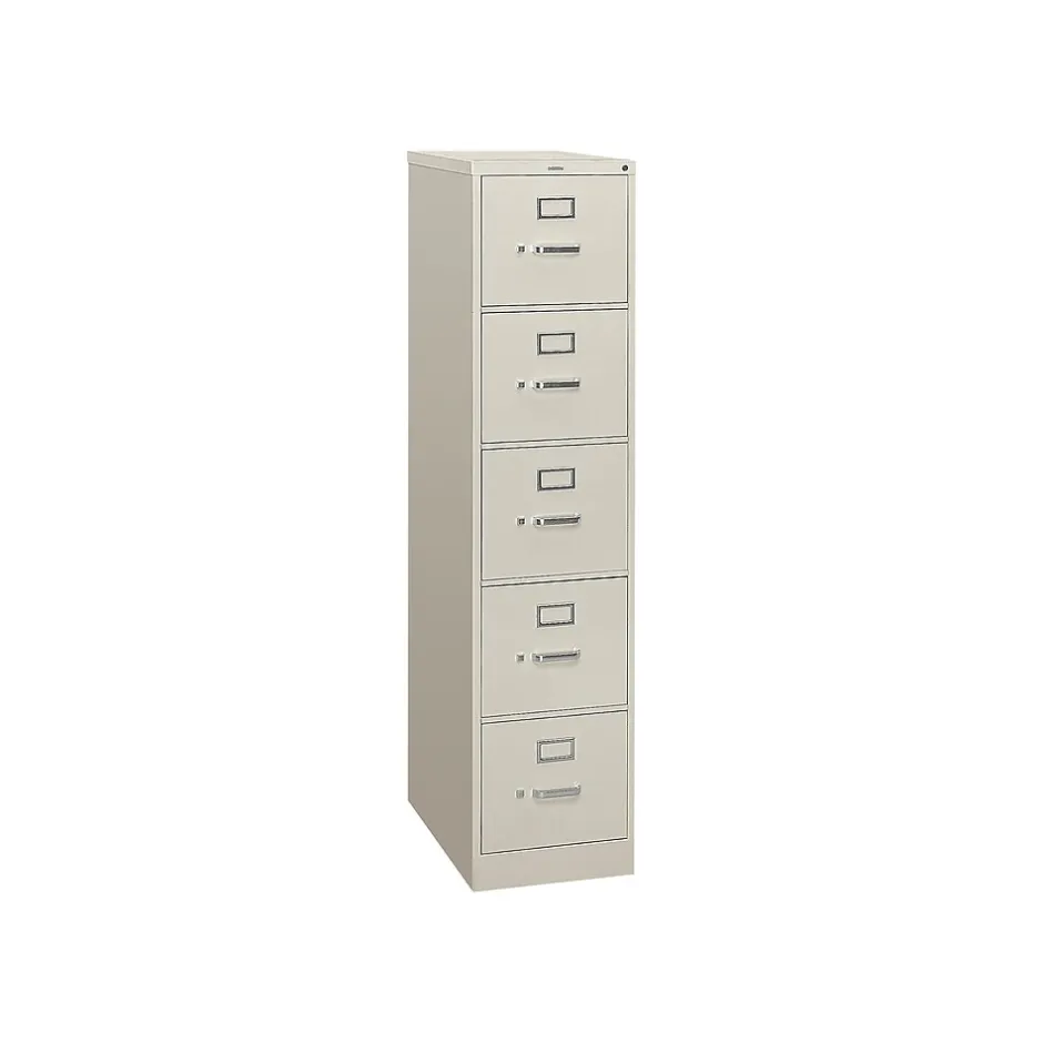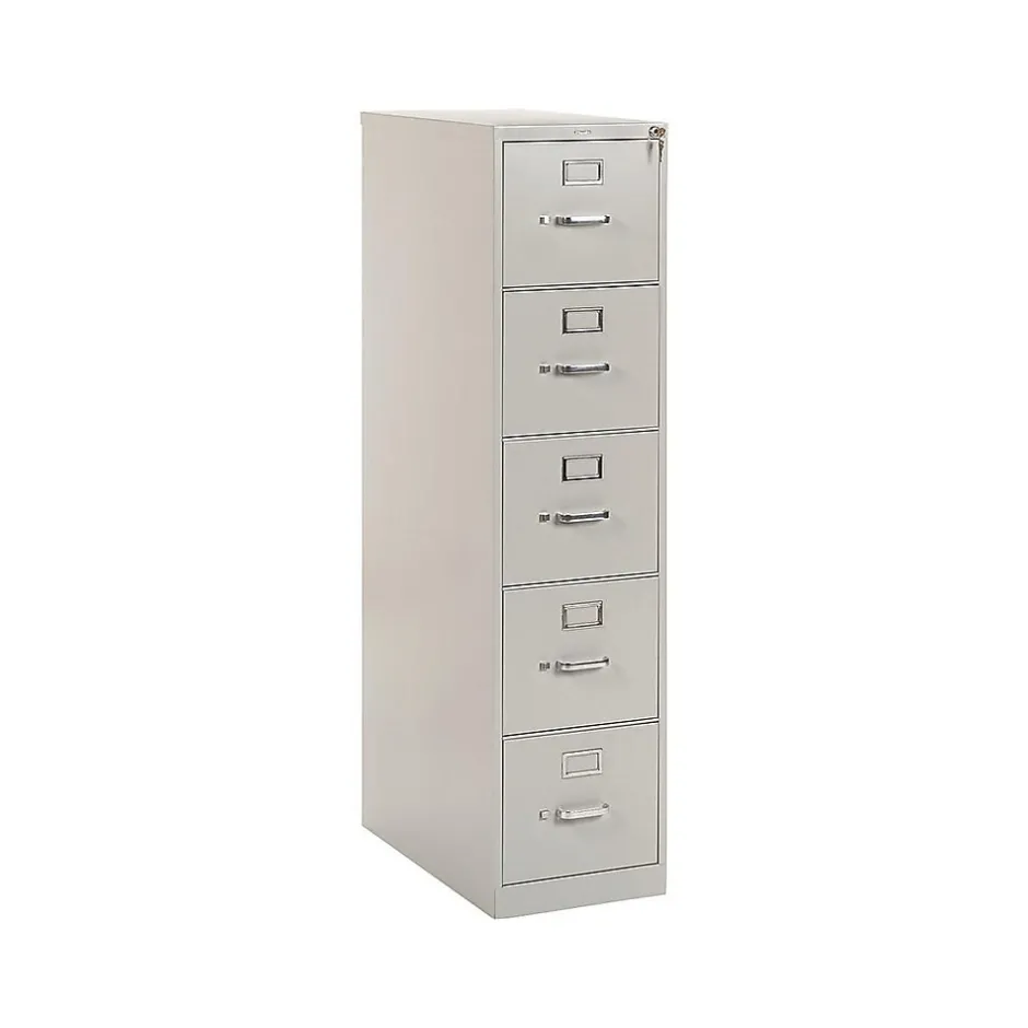 - Five-drawer vertical filing cabinet holds letter-size documents